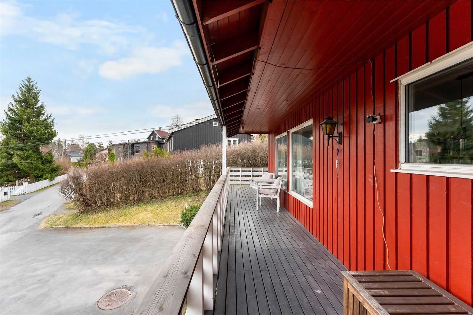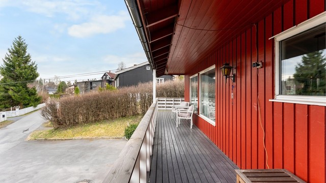 - Utgang fra stue og soverom til veranda på 34 m2. i trekonstruksjoner med rekkverk av tre. Rekkverkshøyde er målt til 0,91 meter. Gulvoverflater er belagt med terrassebord. Verandaen har markise, varmelampe, utvendig stikkontakt og utebelysning.