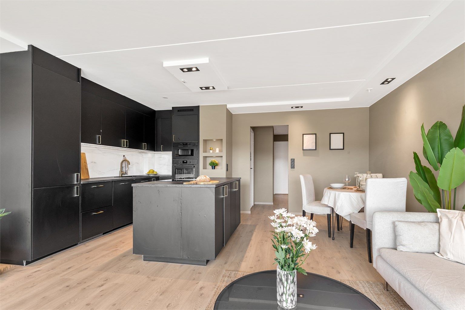 Kjøkkenet er holdt i en sosial og åpen løsning mot stuen. Kjøkkeninnredning er med glatte fronter og laminat benkeplate med nedfelt vaskekum. Av integrerte hvitevarer er det induksjonstopp med kullfilter, stekeovn, micro, oppvaskmaskin og kjøl/fryseskap. Komfyrvakt er også montert. Det er rikelig med oppbevaringsplass i både skuffer og skap, og den store benkeplaten og kjøkkenøyen gjør matlagingen til en fryd. Her kan du tilbedere gode måltider og samtidig sosialisere deg med gjestene.