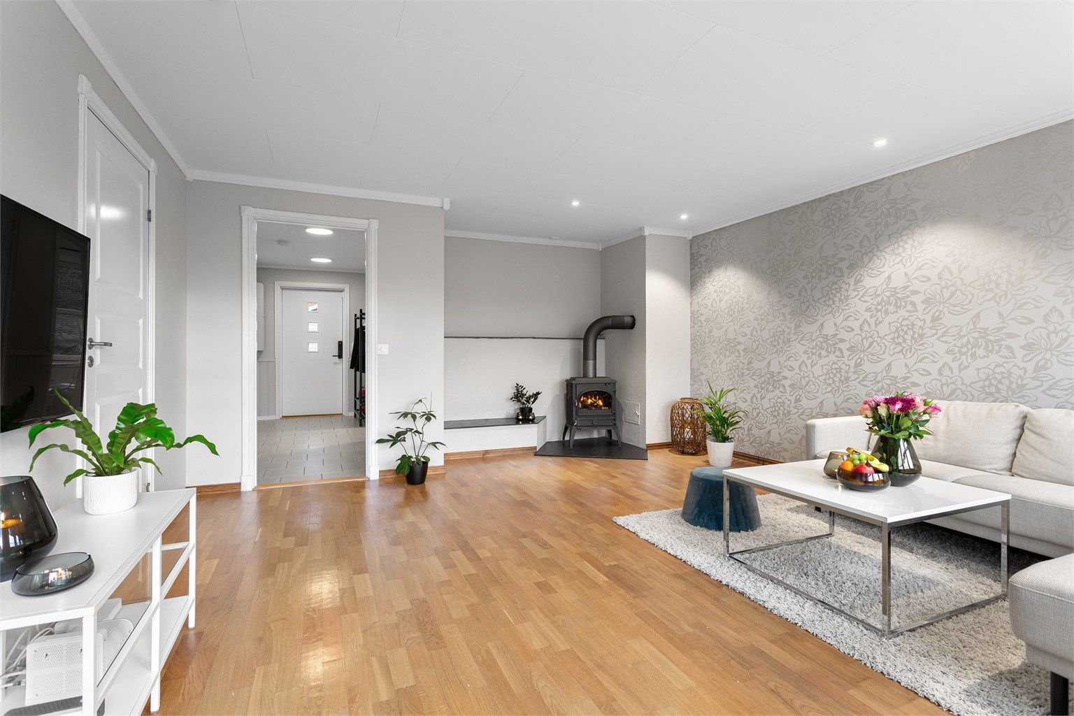 Entre og gang med flislagt gulv. Plass til å henge fra seg yttertøy.