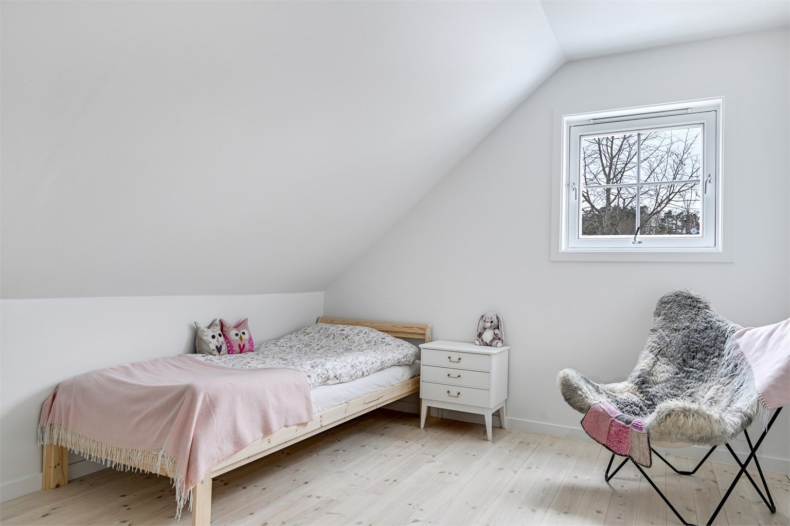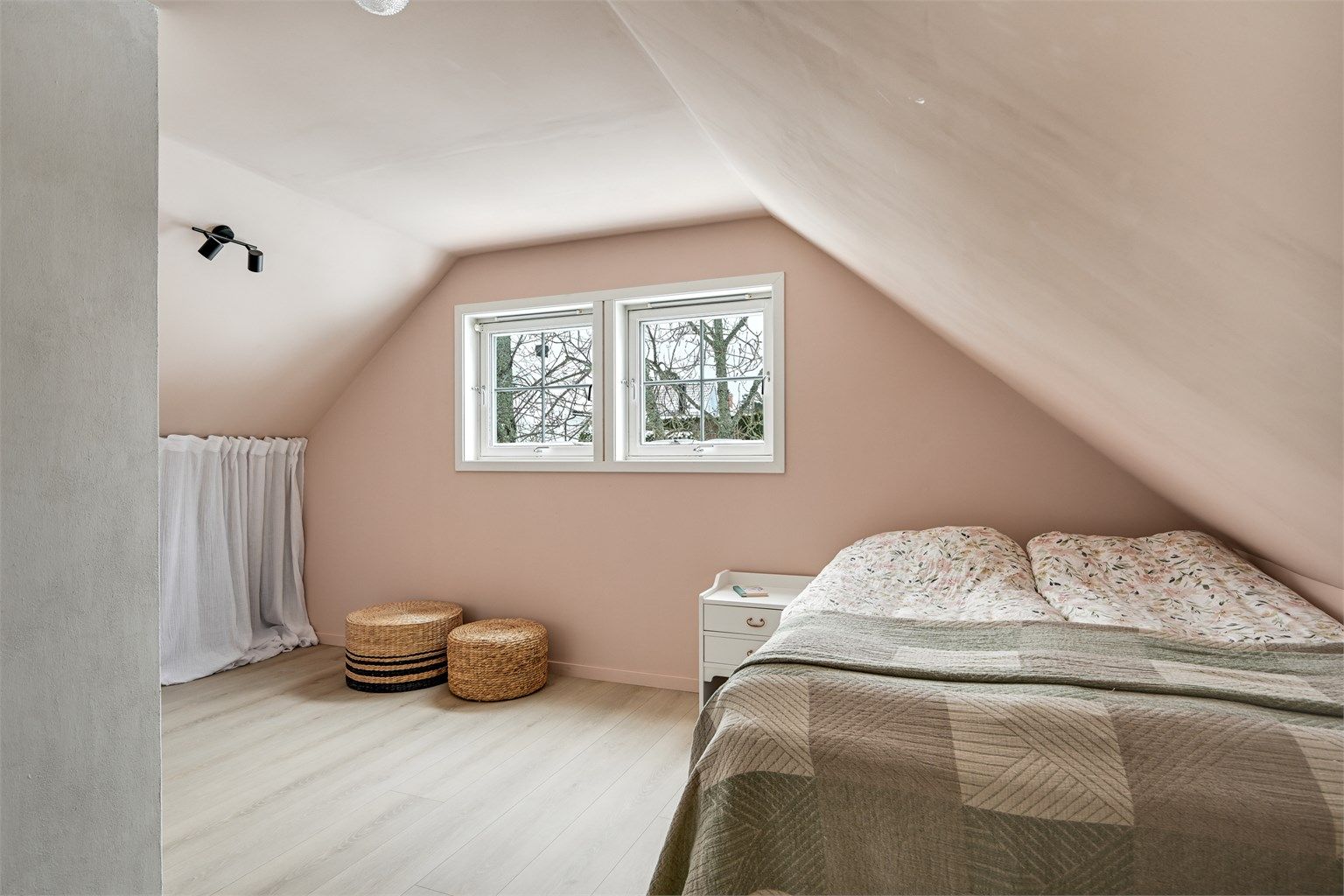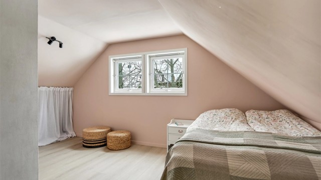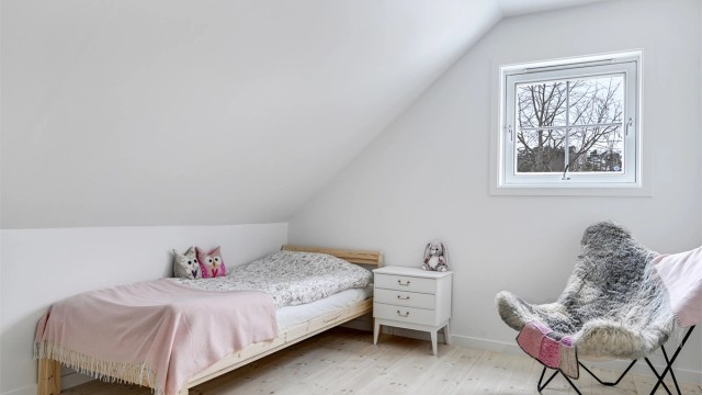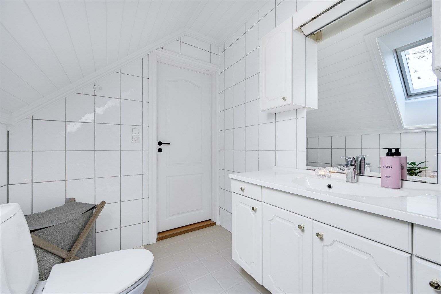 I boligens andre etasje finner du ytterligere to soverom. Her er det også et flislagt bad med varmekabler i gulvet. Badet inneholder heldekkende servant, gulvmontert toalett og innkledd badekar med dusjvegg. Det er montert ny kran/blandebatteri på både servant og dusj/badekar i 2025. I tillegg finnes et praktisk kott, ideelt for ekstra oppbevaring.
