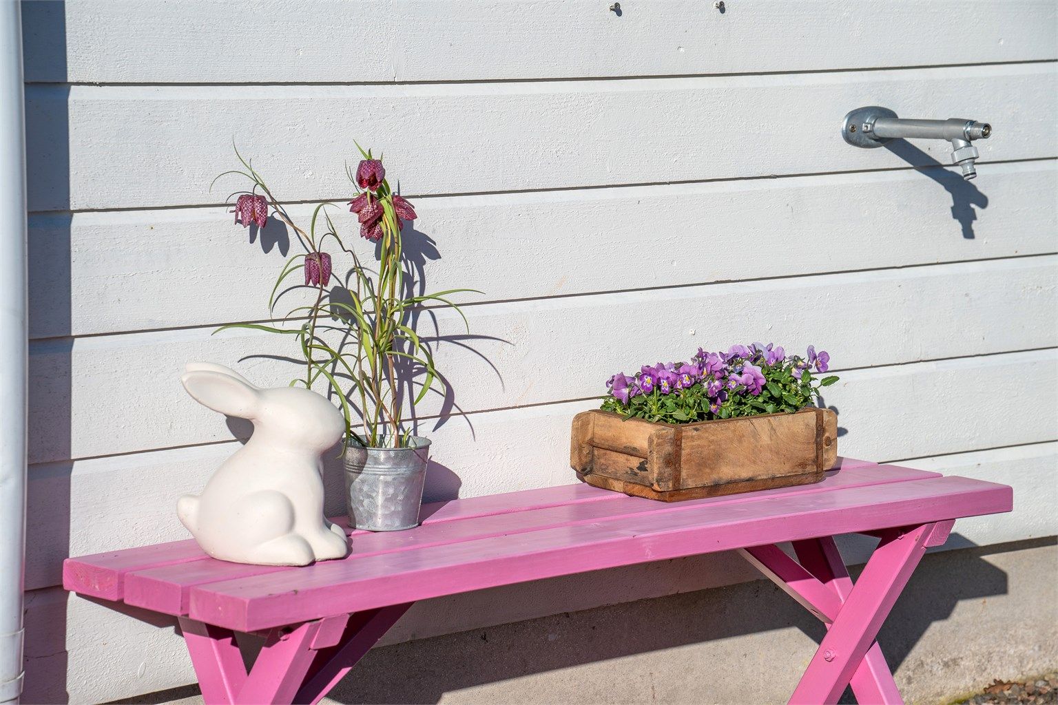Stuen oppleves lun og koselig, med store vindusflater som slipper inn rikelig med naturlig lys. Her er det også installert luft-til-luft varmepumpe. Fra stuen er det direkte utgang til en solrik terrasseplatting på ca. 34 kvm, med videre adkomst til en deilig hage – et flott sted for avslapning og hyggelige sommerdager.
