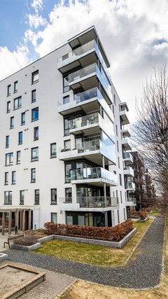 Utvendige fasader i pussede, malte flater. Tilnærmet flat takkonstruksjon. Leiligheten har slett entrédør med brannklasse EI30 og lydklasse Rw 38dB.