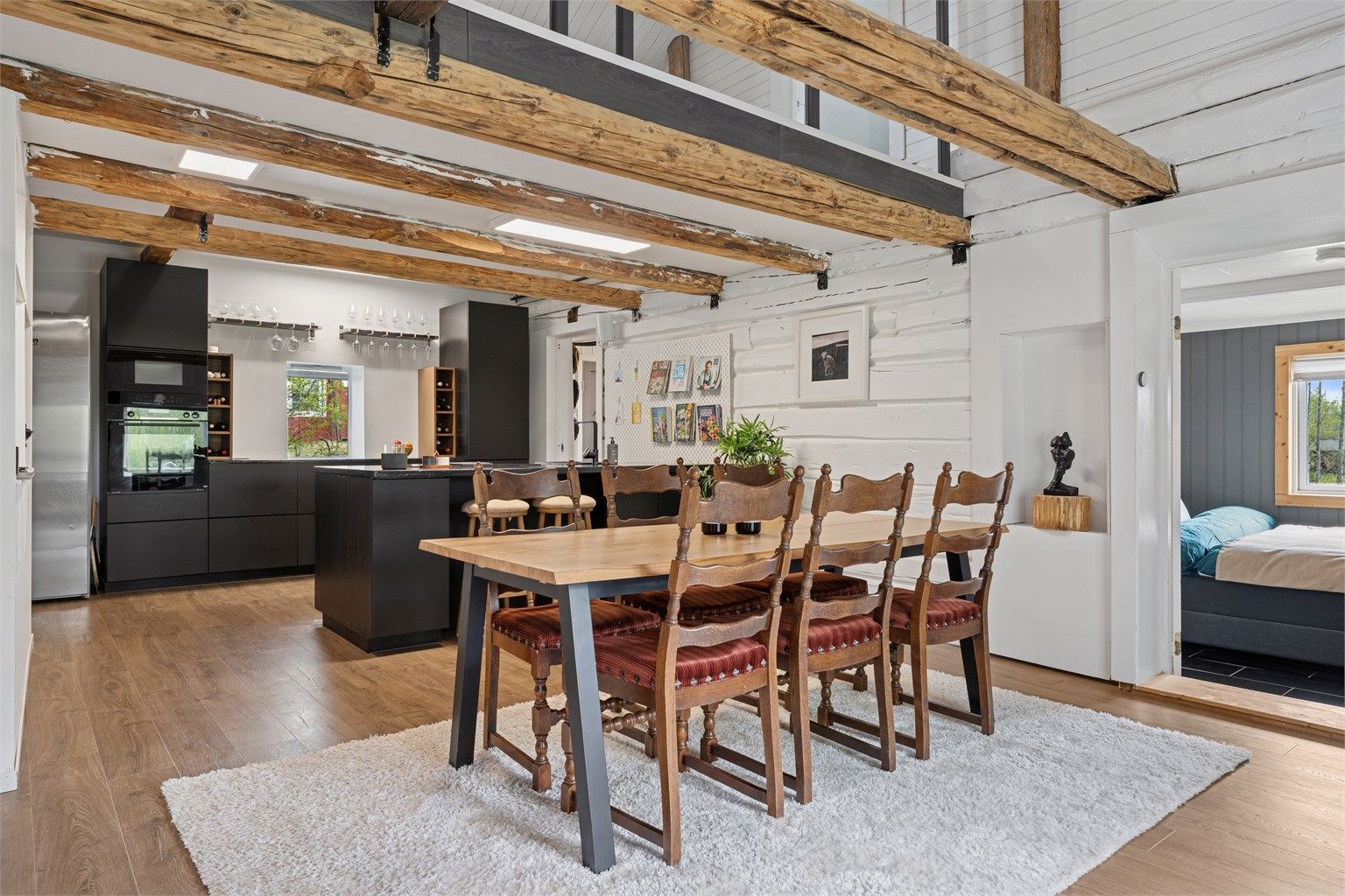 Stilig detalj med eksponerte tømmer-dragere gjennom boligen. Kjøkkenet er fra fra 2021 med pen innredning og integrerte hvitevarer.