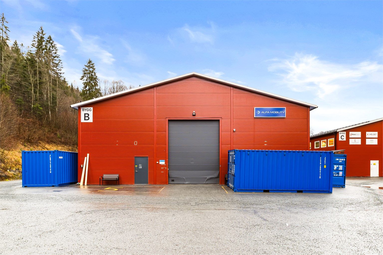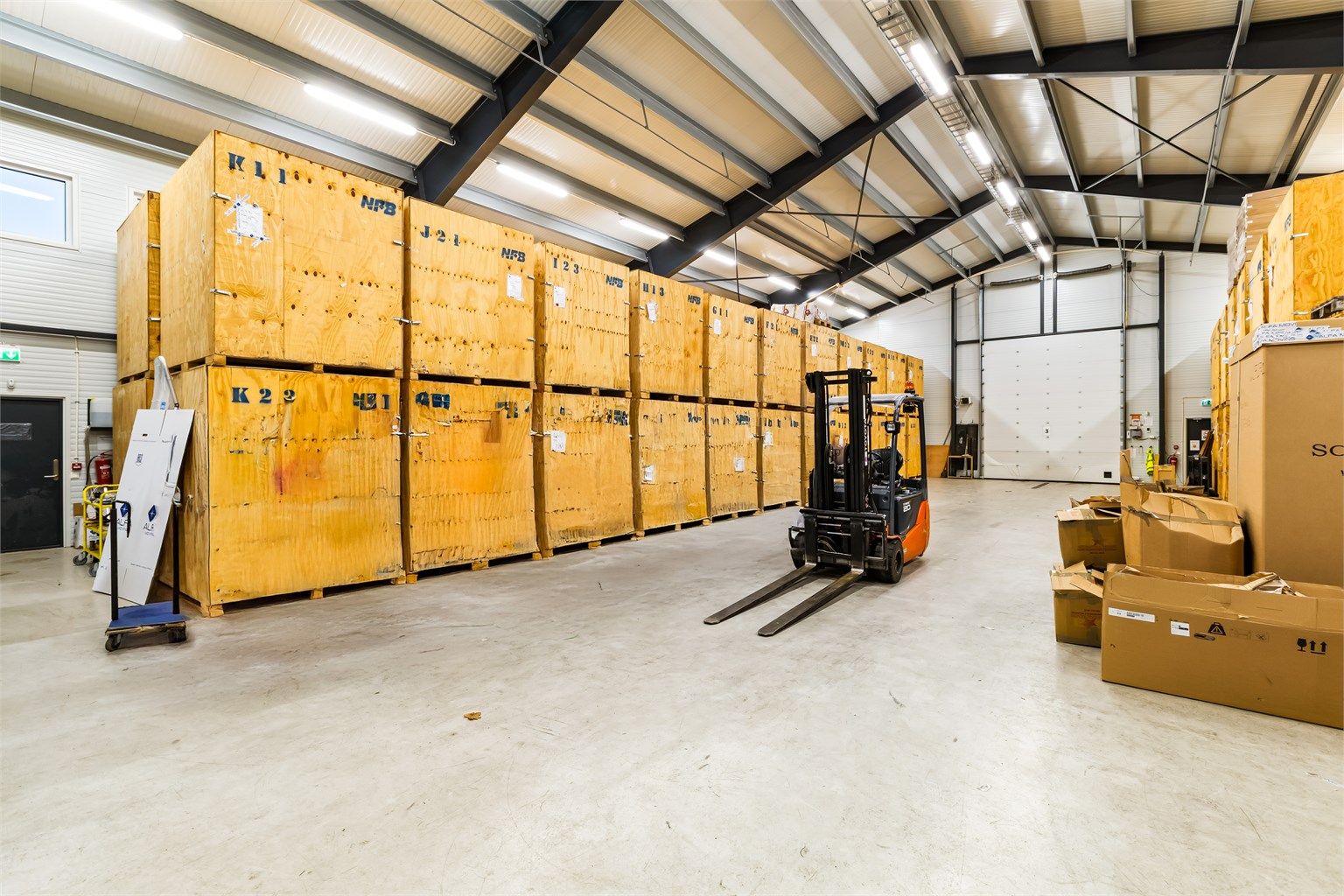 Lagerbygget er på 990 kvm BTA og består av et lager med 8 meters takhøyde i møne og 6 meter langs ytterveggene. Det er 3 kjøreporter inn til lageret hvorav porten på gavlveggen er 5 meter i høyden.