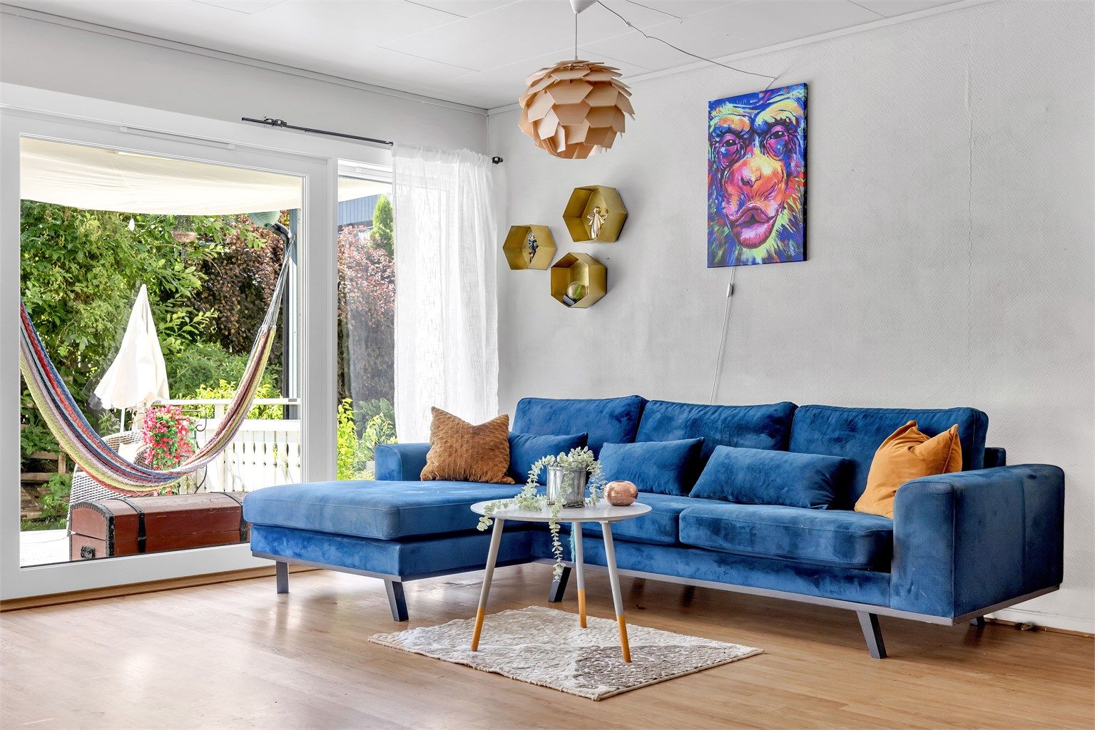 Boligen har en stue med mange spennende muligheter. Det er lagt laminat på gulvet og malte/tapetserte vegger.