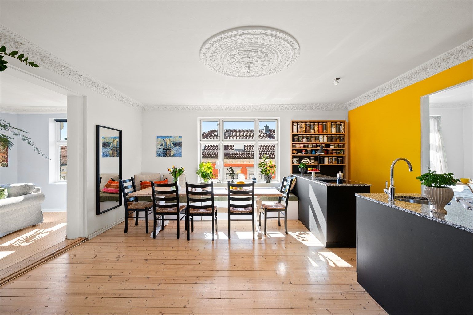 Klassiske detaljer som stukkatur, rosett, fløydører, originale tregulv