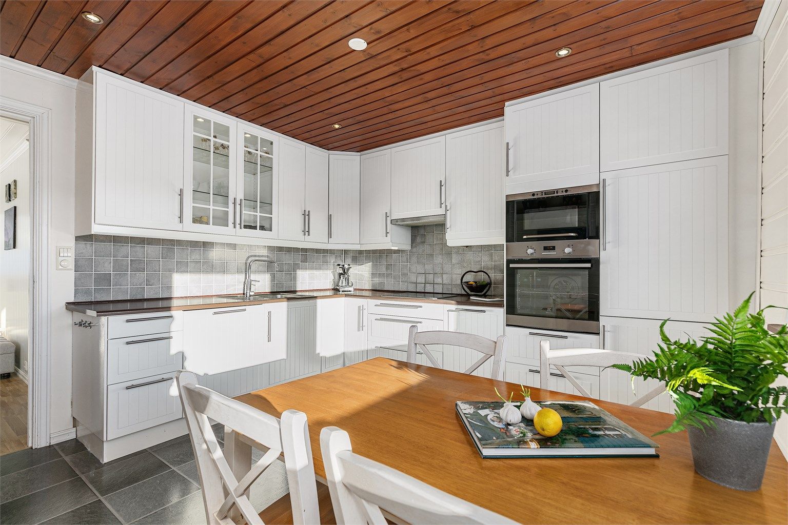 Inne har boligen et lyst og tidsmessig fargevalg, og det er parkettlaminat i de fleste rom. Det er en romslig stue med gode vindusflater, samt stort og pent kjøkken med integrerte hvitevarer. Videre er det bad med dusjkabinett, separat wc, tre soverom og boder (blir i dag brukt som soverom).