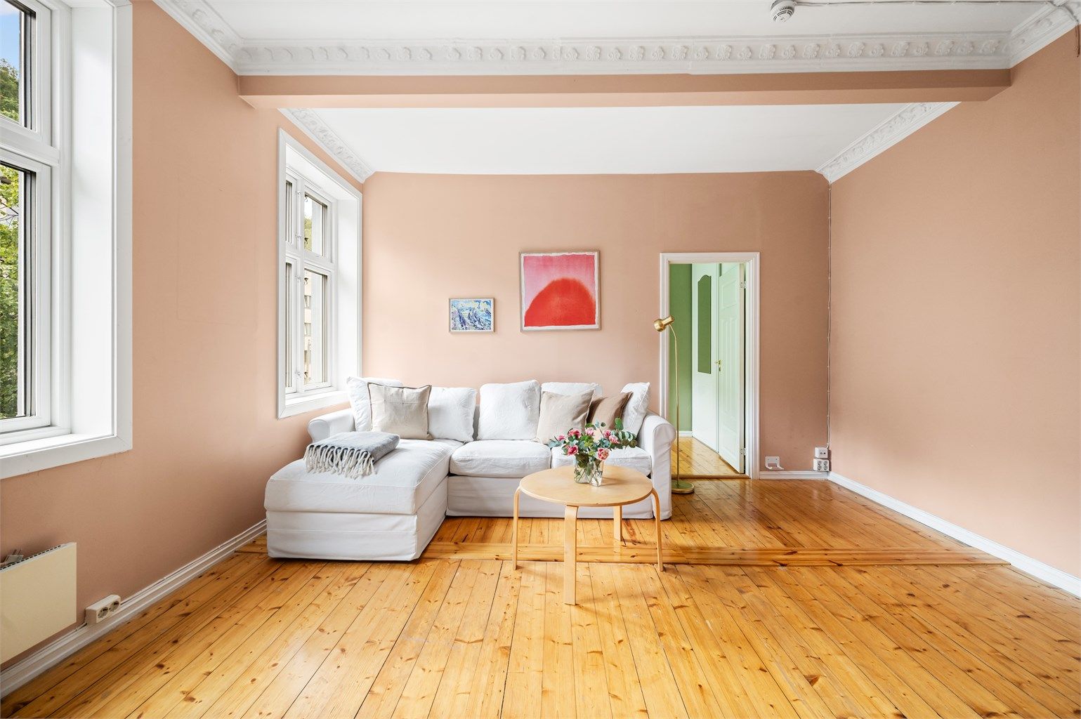 Klassiske detaljer med generøs takhøyde, stukkatur og rosett