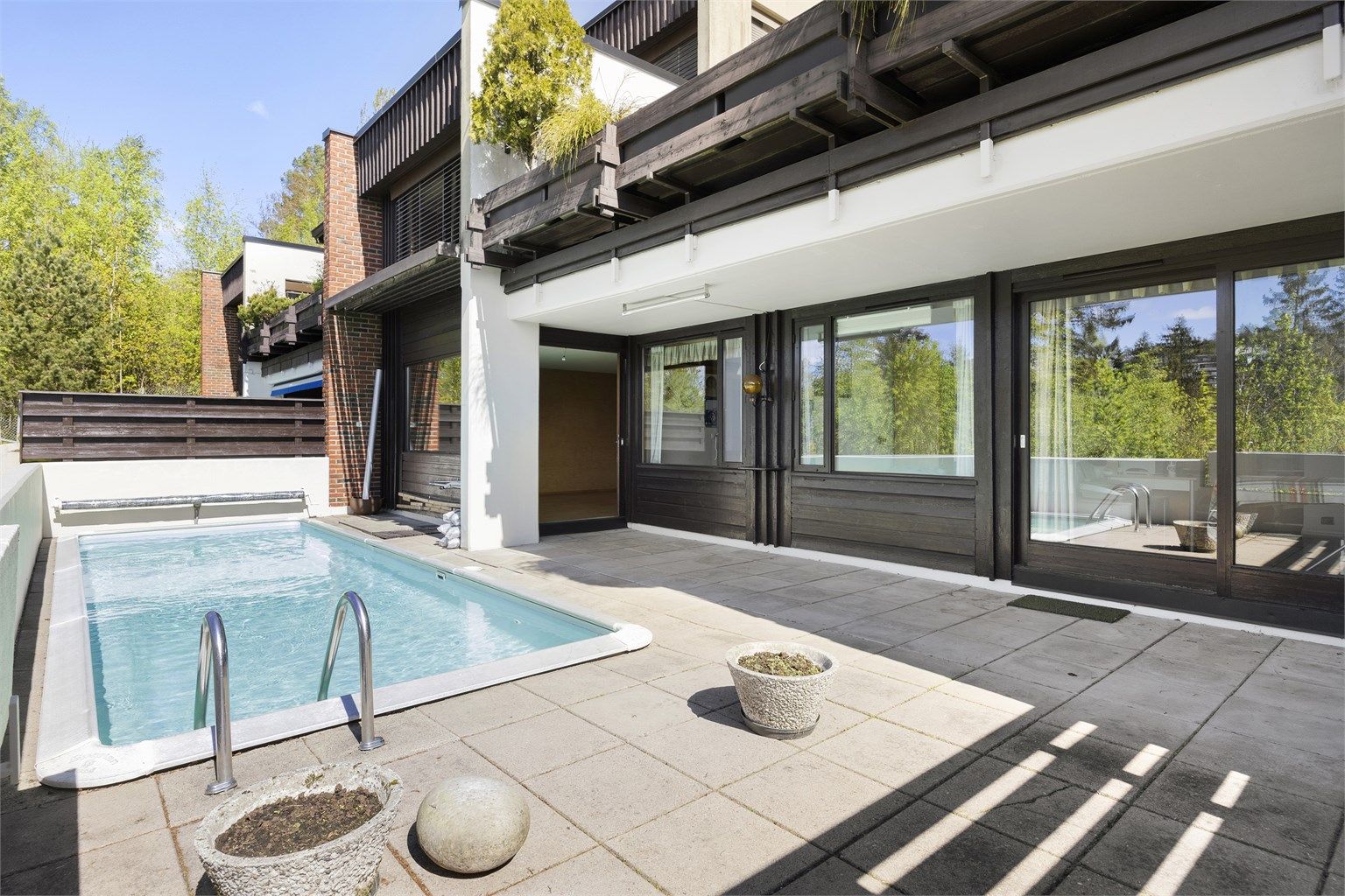 Utgang fra stue og soverom til stor terrasse med svømmebasseng.