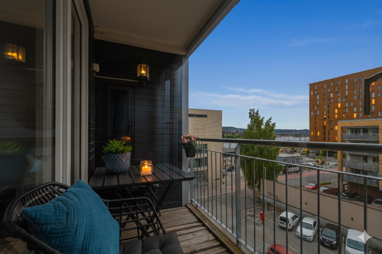 Lys og stilren 2-roms toppleilighet i 5. etasje med overbygget sydøstvendt balkong (ca. 3 kvm). Åpen kjøkken- og stueløsning med store vindusflater. Pent kjøkken med komfyr og oppvaskmaskin. Flislagt bad med opplegg for vaskemaskin/tørketrommel. Fjernvarme med radiatorer inkludert i felleskostnadene. Lagringsplass i innvendig bod og kjellerbod.