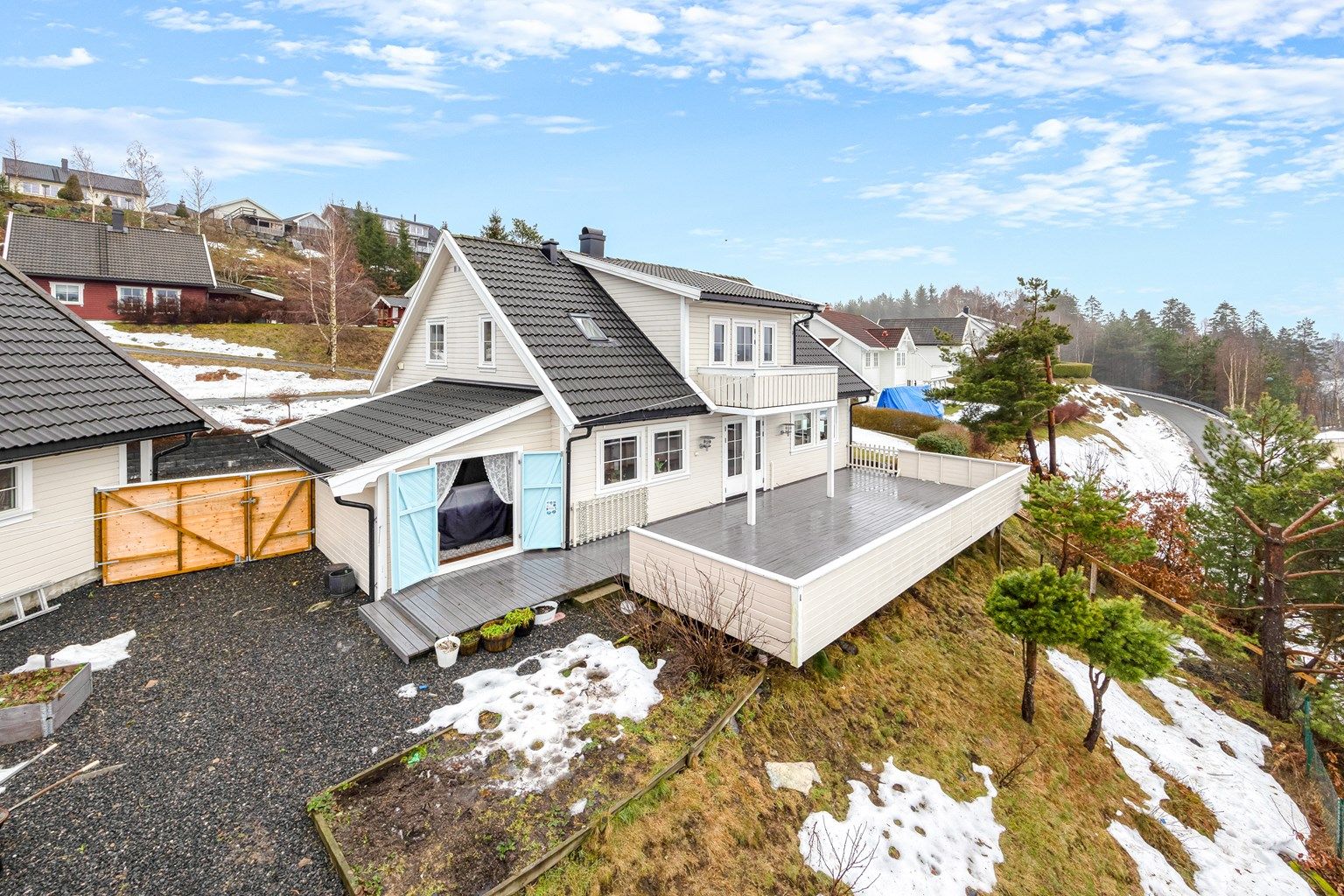Meget sentral beliggenhet midt mellom Arendal, Grimstad og Froland. Landlig men samtidig sentralt i et etablert og rolig boligområde i naturskjønne omgivelser uten gjennomgangstrafikk. Kort avstand til flotte skogs- og turområder. Høyt og frittliggende med sen kveldssol på sommerstid samt flott utsikt til områdene rundt. Pent opparbeidet tomt med plenarealer, hekk, terrasser, beplantning og gruset innkjørsel. Eneboligen har god planløsning med fire soverom, to bad, stue, loftstue/soverom, kjøkken, entré, utebod og sommerstue.