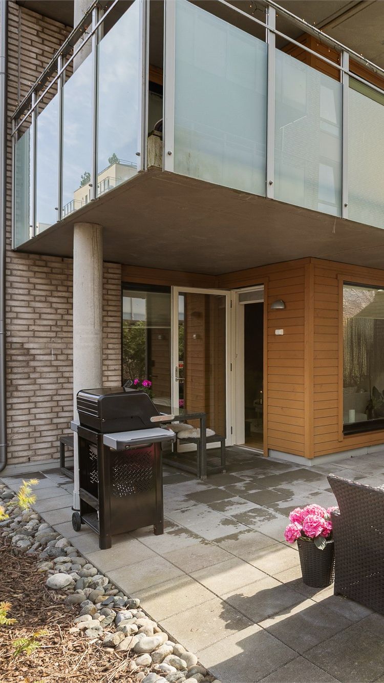 Markterrasse (ca. 28 kvm): Vestvendt uteplass som er omkranset av plantekasser og beplantning. Plass til utemøbler, gassgrill, m.m. Betongheller. Dobbel stikkontakt på vegg. Deler av uteplassen er under tak, så her kan du sitte ute selv om det regner.