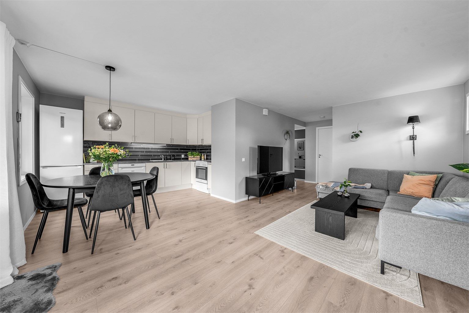 Fornuftig og arealeffektiv planløsning med god utnyttelse av bruksarealet, kjøkken i åpen løsning mot stuen med plass til spisebord mellom kjøkken- og stuedelen. Leiligheten ligger på enden og har fordelen med ekstra vindusflater på kortveggen, godt med naturlig lys og god romfølelse. Fra stuen er det direkte utgang til stor og vestvendt terrasse på 19 kvm. som er delvis overbygd og med terrasseport ut til fellesområdet.