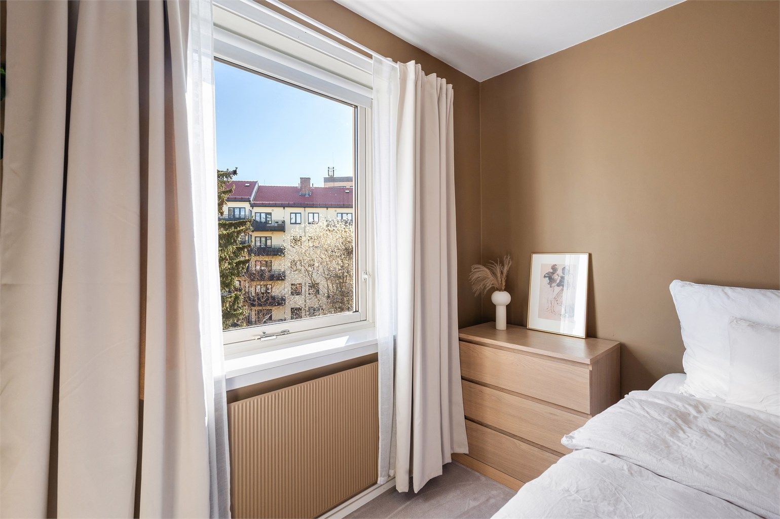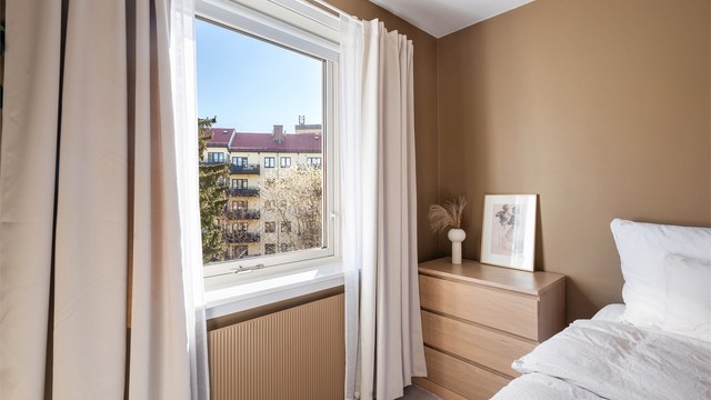 Romslig, østvendt soverom uten innsyn, med vindu mot rolig bakgård. Her kan du sove godt! God plass til dobbeltseng, nattbord og oppbevaring. Åpen garderobe med god lagringsplass som medfølger. Gulvet er belagt med teppe i 2022 for en eksklusiv hotellfølelse.