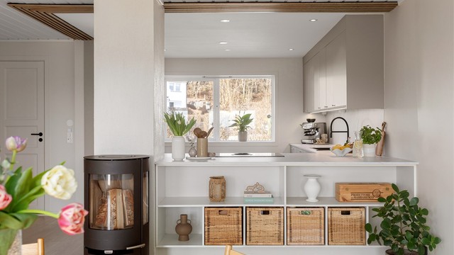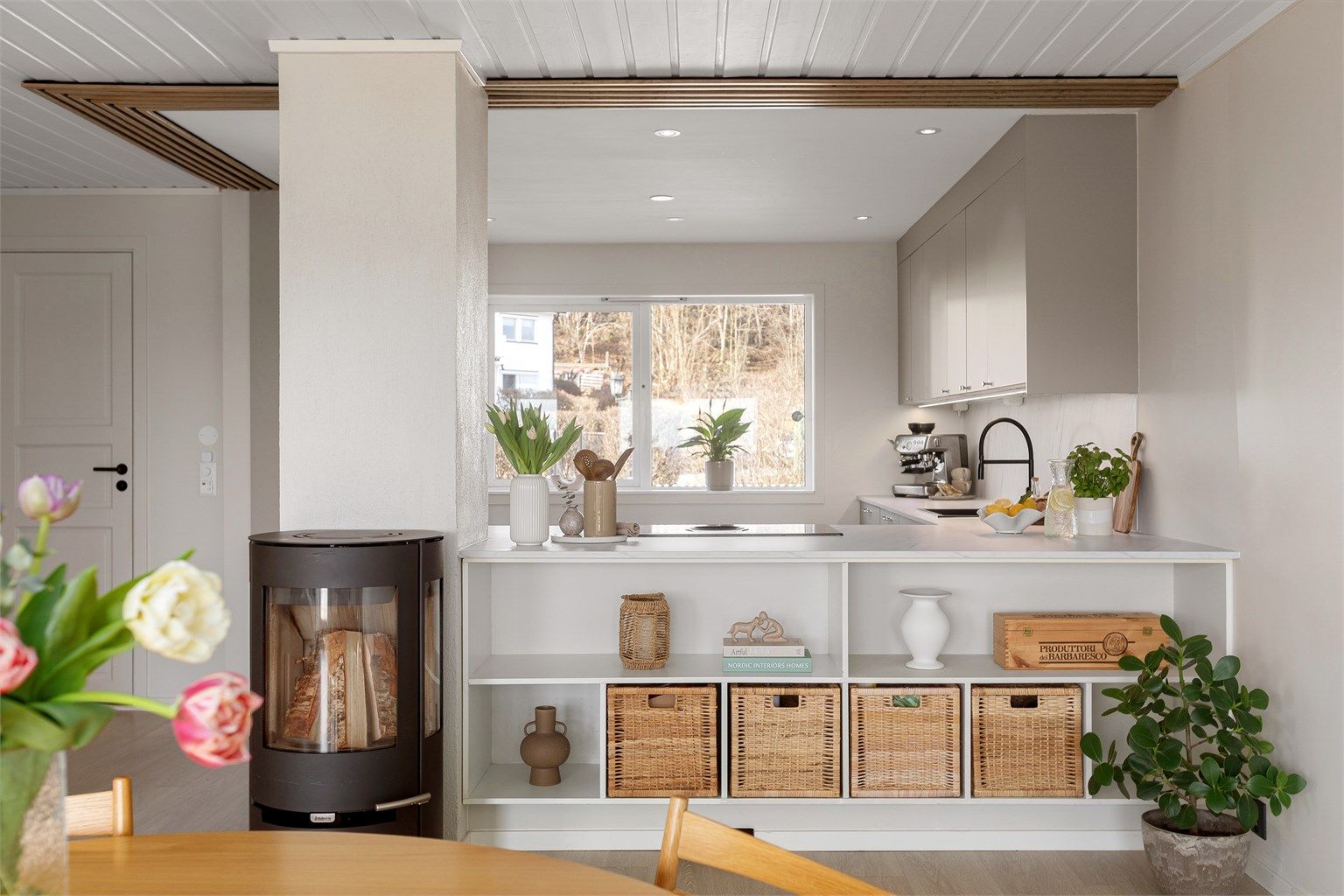 -I forbindelse med ombygging av kjøkken ble vegg mellom stue og kjøkken fjernet, og eksisterende vedovn/pipeløsning i dette området ble tatt ut. Nytt kjøkken ble etablert på samme plass som tidligere kjøkken. Tømrerarbeidet er utført av undertegnede. Arbeid utført av rørlegger/elektriker og puss/murarbeider er dokumentert i Boligmappa. Arbeidet ble gjennomført ca. januar 2023. - utført av faglært.