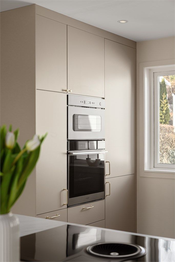 Lyst og moderne kjøkken fra 2023 med åpen løsning mot stue. Kjøkkenet er innredet med over- og underskap med slette fronter, benkeplate i kompositt fra HTH, benkebelysning og stikkontakter over kjøkkenbenk. Integrerte hvitevarer: stekeovn fra Whirlpool, platetopp fra Elica, oppvaskmaskin fra AEG, mikro og kjøleskap med fryser.
