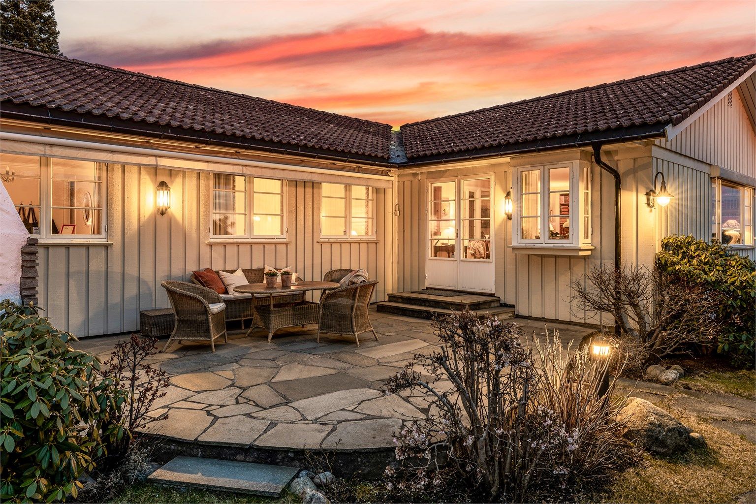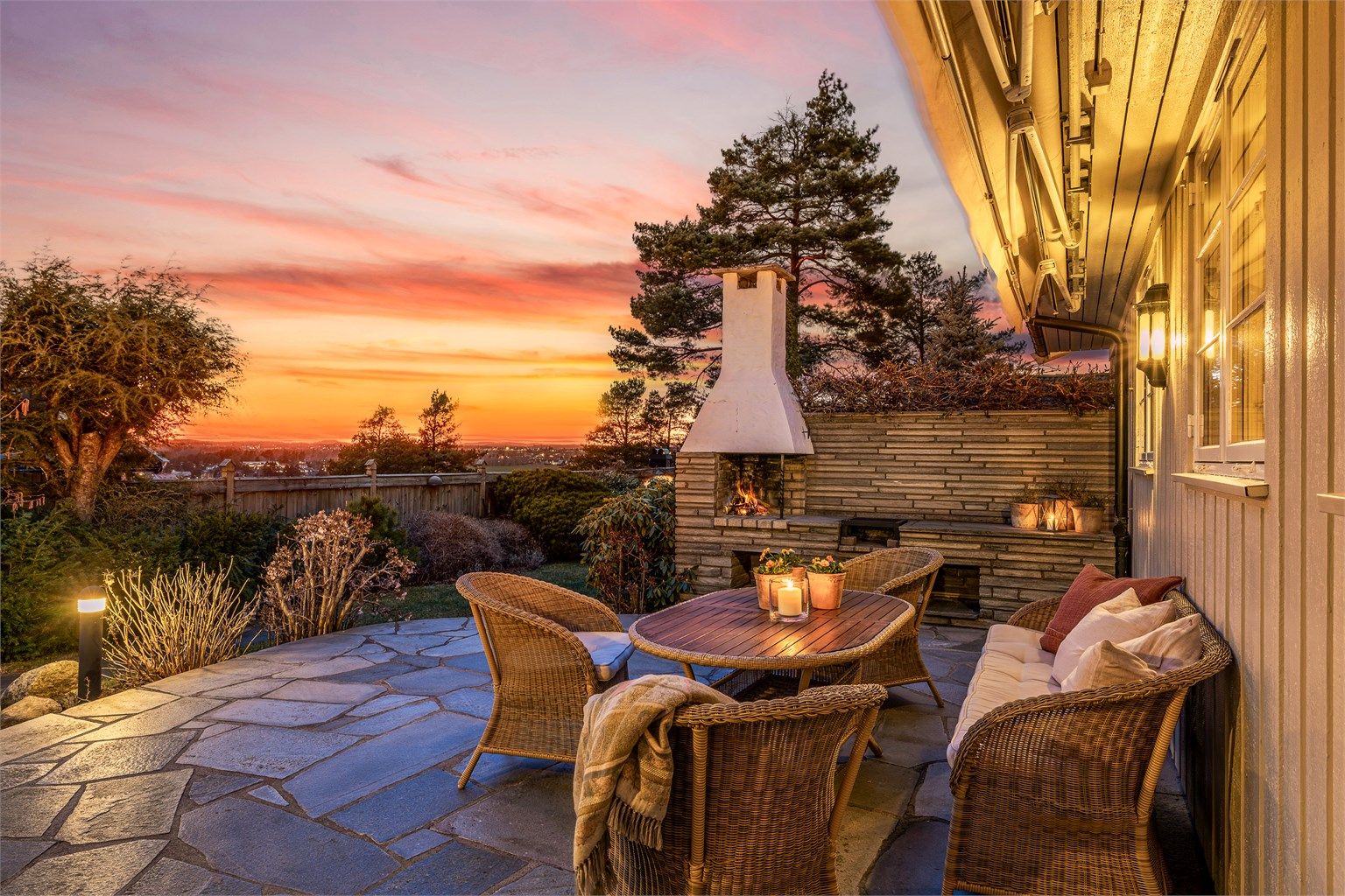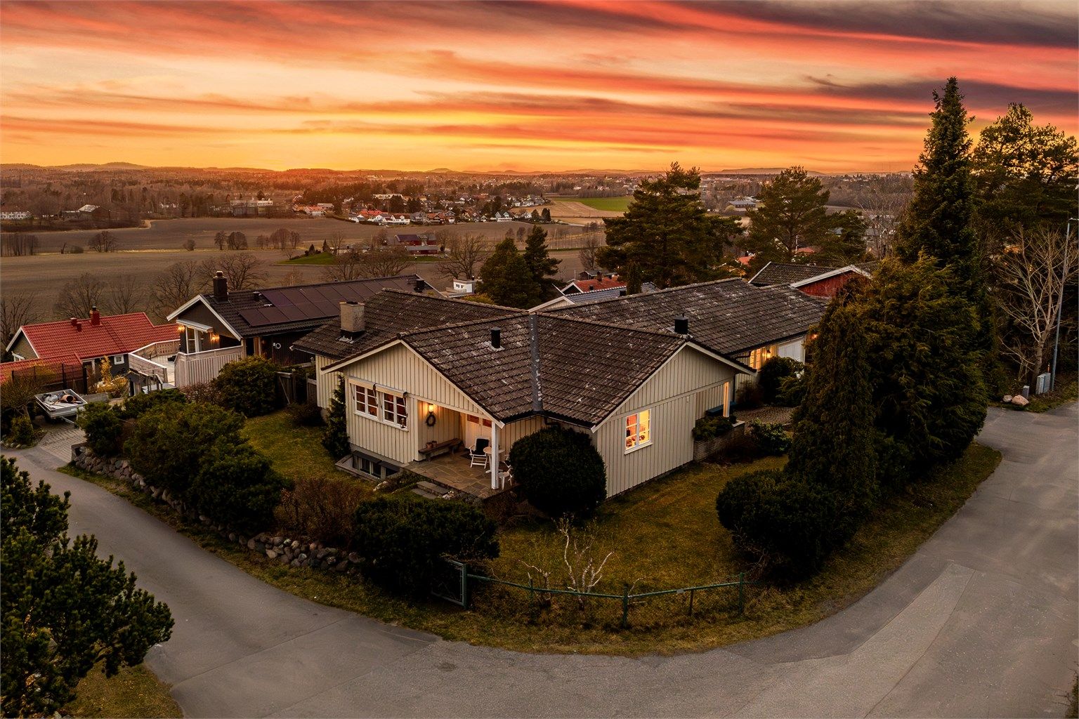 Beliggenheten er høy og luftig, med fantastisk utsikt, solrikt og spektakulære solnedganger. Eiendommen har en nydelig, opparbeidet hage med frodige busker, trær, blomsterbed og en hyggelig utepeis. Her finner du flere flotte uteplasser som lar deg følge solen gjennom hele dagen – perfekt for både rolige morgenstunder og sene sommerkvelder.