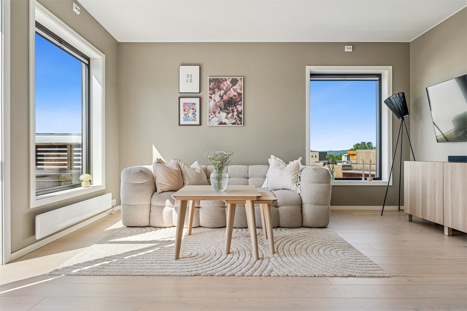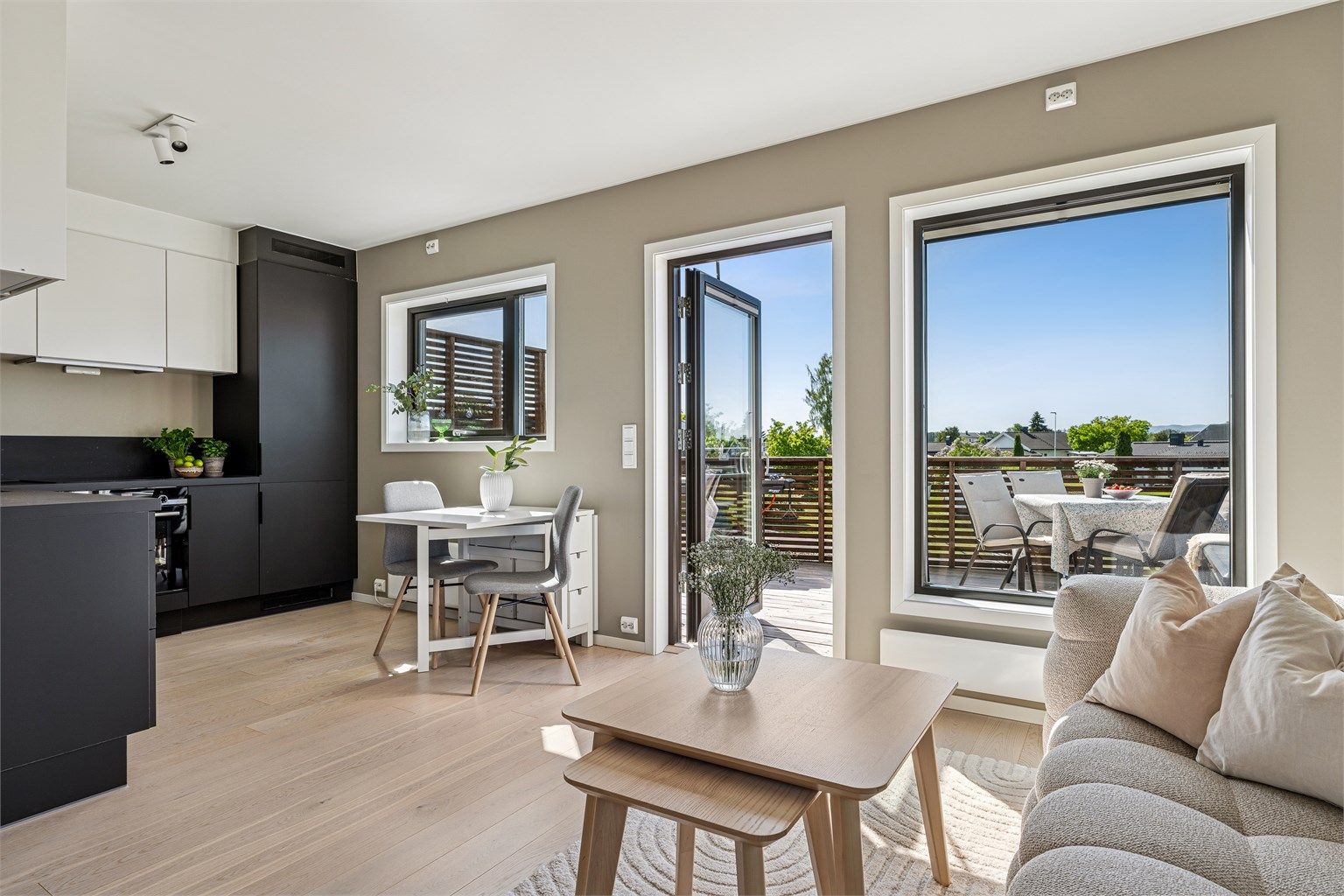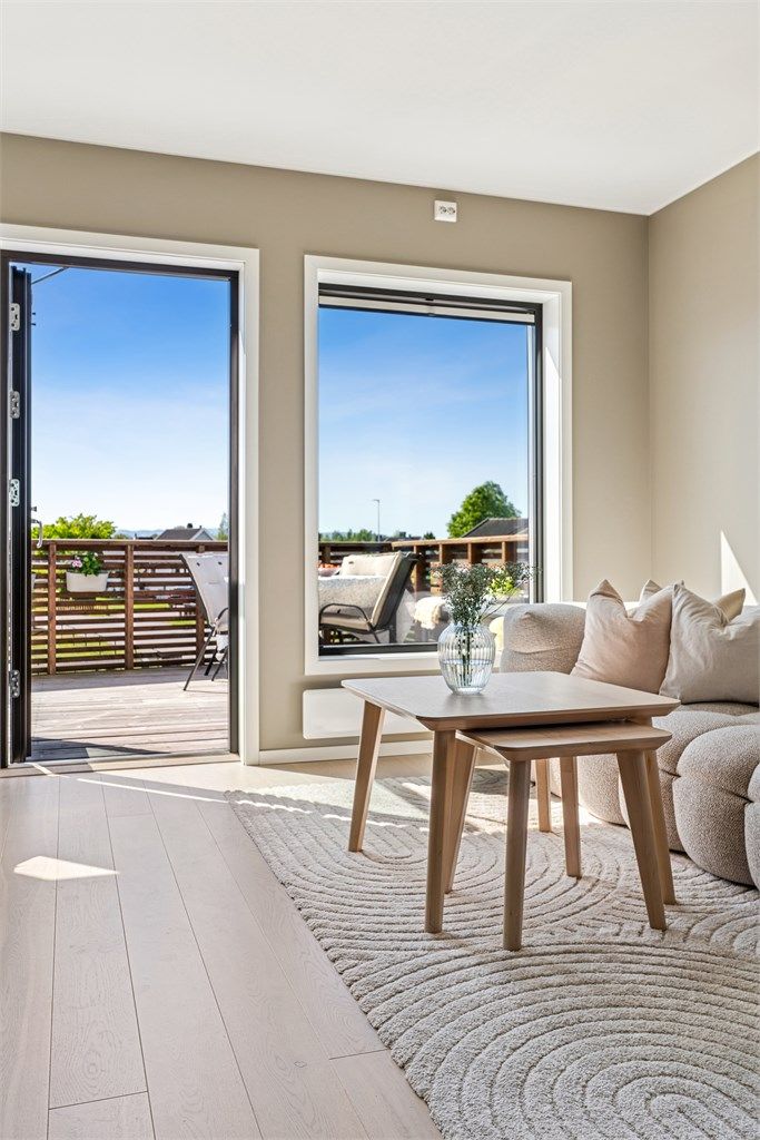 Nyere og moderne 2-roms eierleilighet med solrik balkong, peis og carport. Gjennomgående flotte farge- og materialvalg.