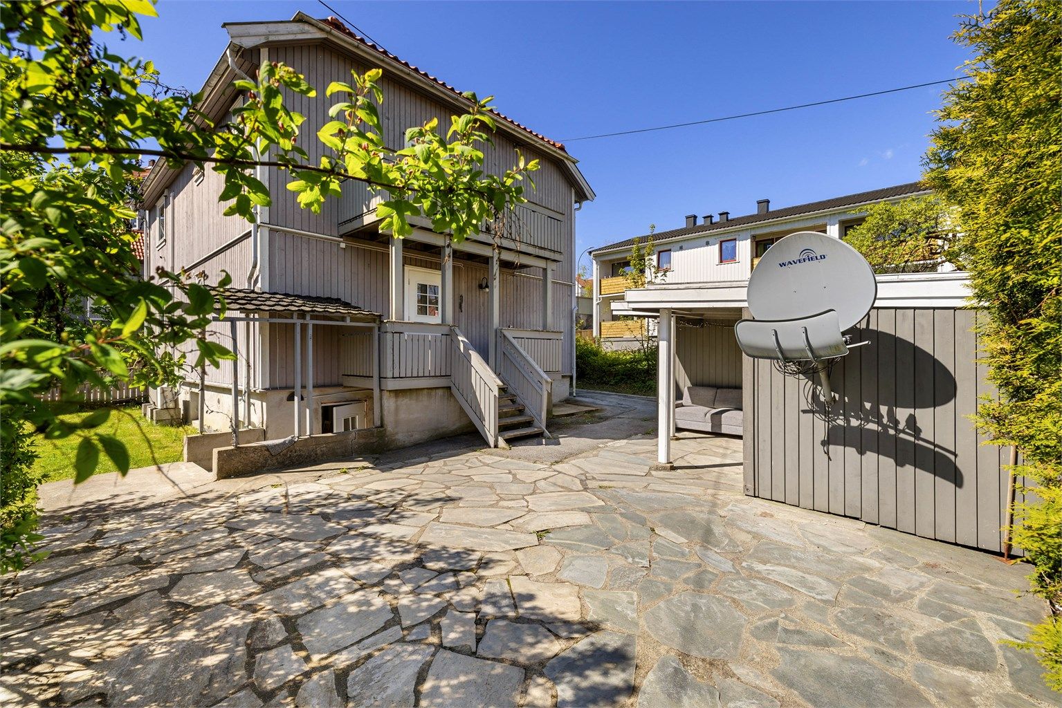 Tilbaketrukken og usjenert bakgård med vakre heller av bruddskifer