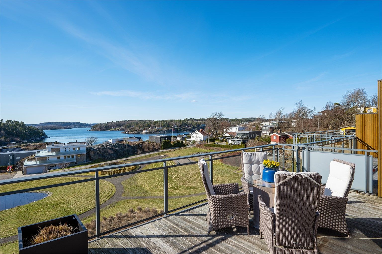 Unik toppleilighet over to plan med nydelig sjøutsikt - to store vestvendte terrasser og garasjeplass. Båtplass!