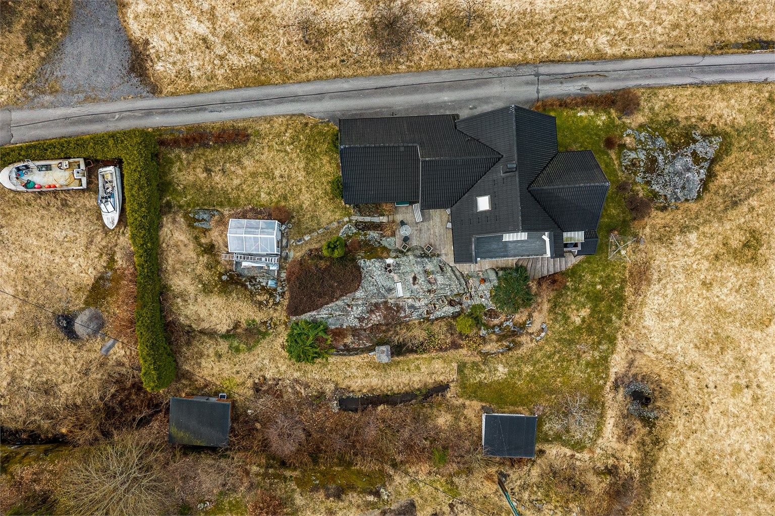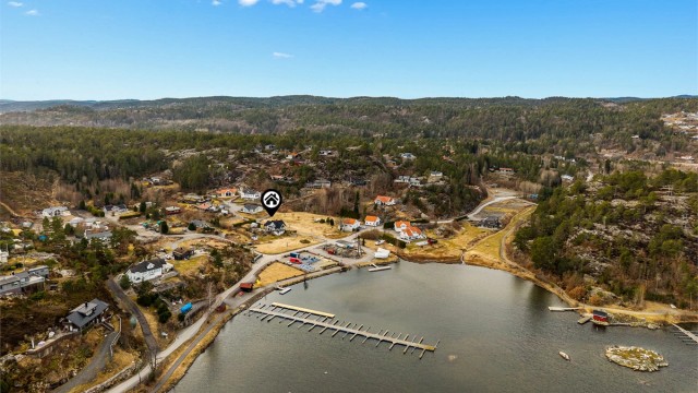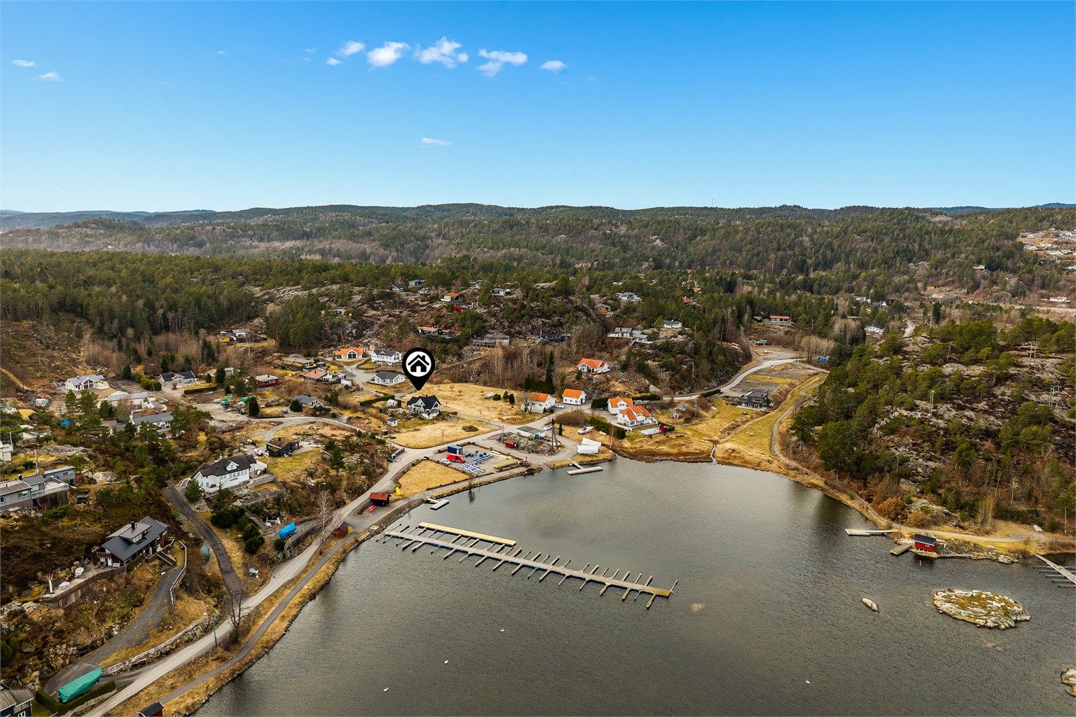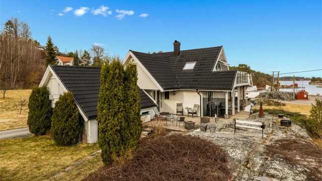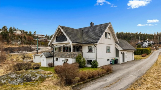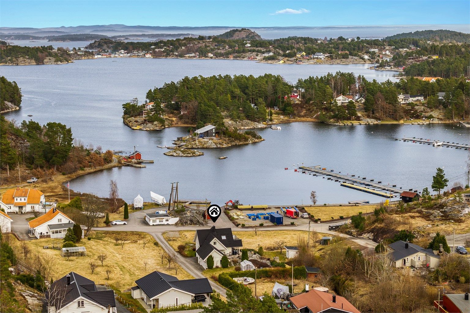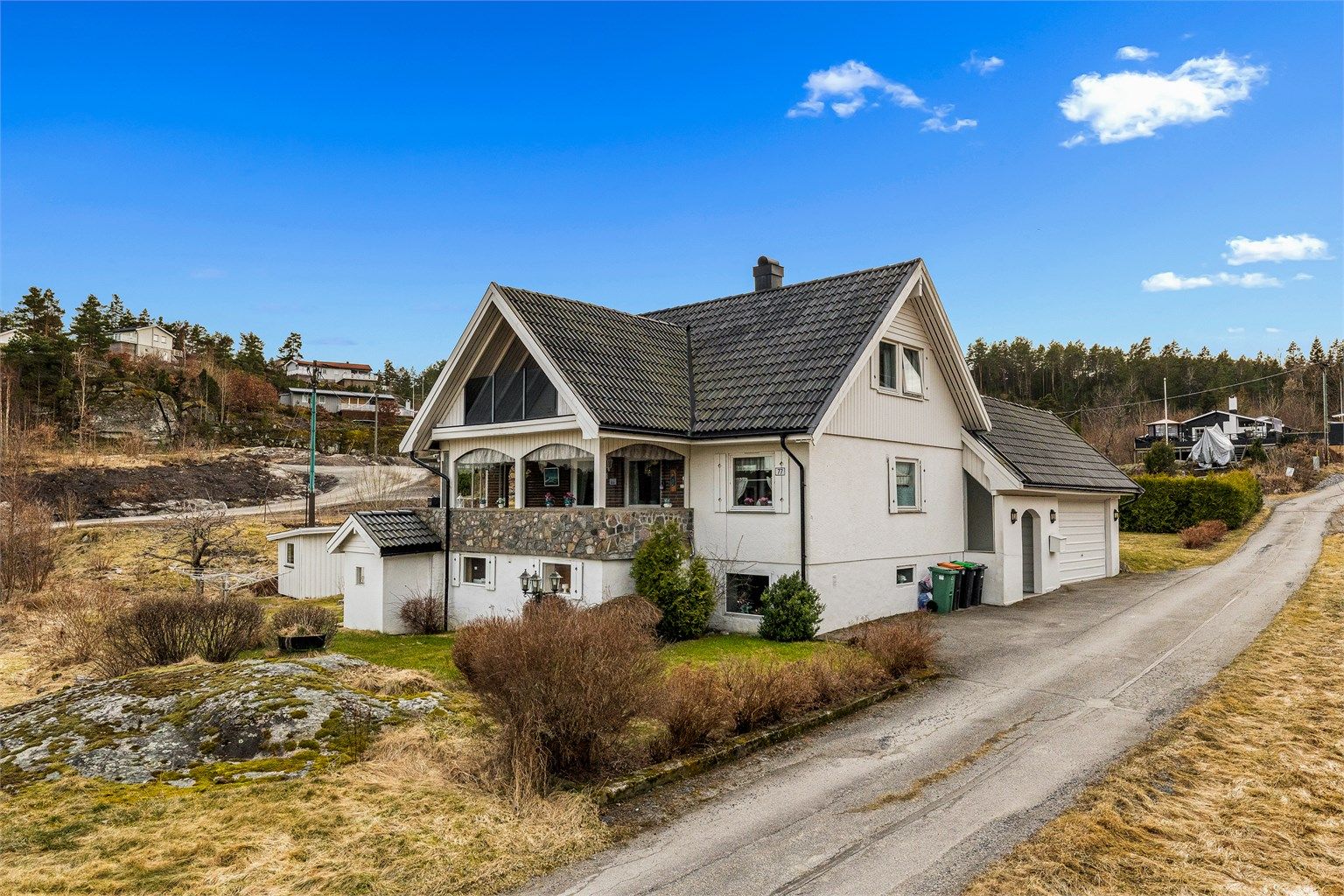 Eiendommen ligger fint ved sjøen på en kolle og har enkel adkomst, store terrasseflater, to uthus og drivhus. Stor dobbel garasje med verkstedbenk, smøregrav og leddport med elektrisk åpner. Selve huset er oppført i 1-1/2 etasje pluss kjeller. Eiendommen har rett til båtfeste. Nærområdet byr på vakker skjærgård og frodig natur.