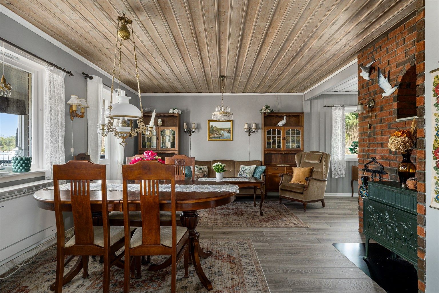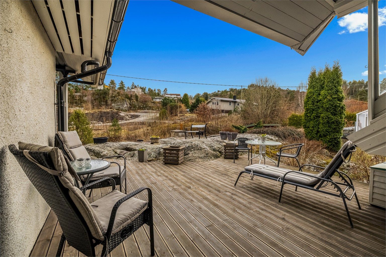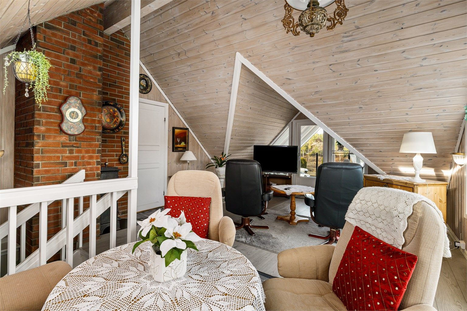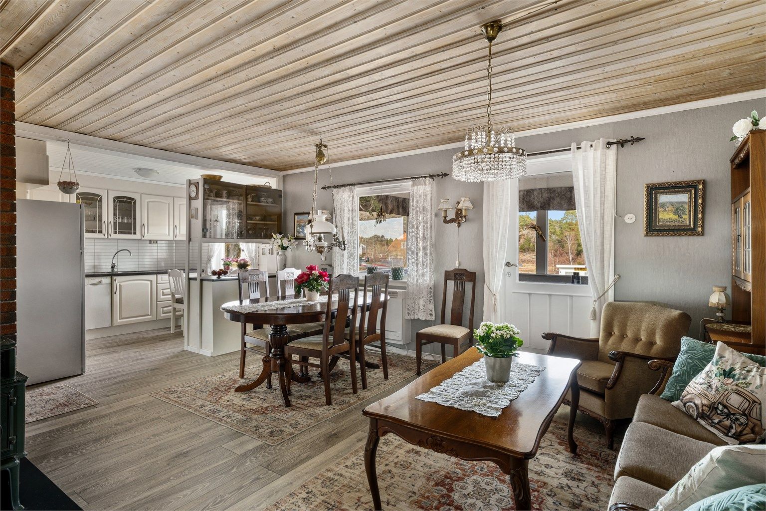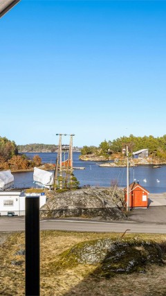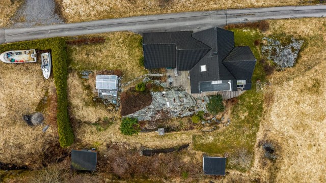 Eiendommen ligger fint ved sjøen på en kolle og har enkel adkomst, store terrasseflater, to uthus og drivhus. Stor dobbel garasje med verkstedbenk, smøregrav og leddport med elektrisk åpner. Selve huset er oppført i 1-1/2 etasje pluss kjeller. Eiendommen har rett til båtfeste. Nærområdet byr på vakker skjærgård og frodig natur.