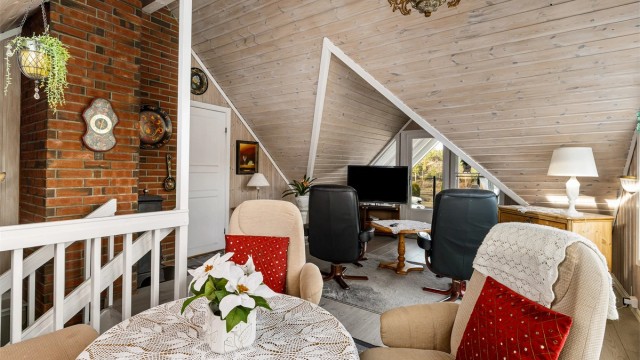 Vegger med malt trepanel. Himling/skråtak med malt, slett flate. Stikkontakter.