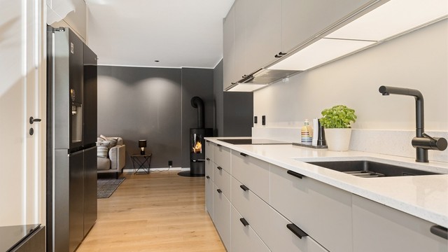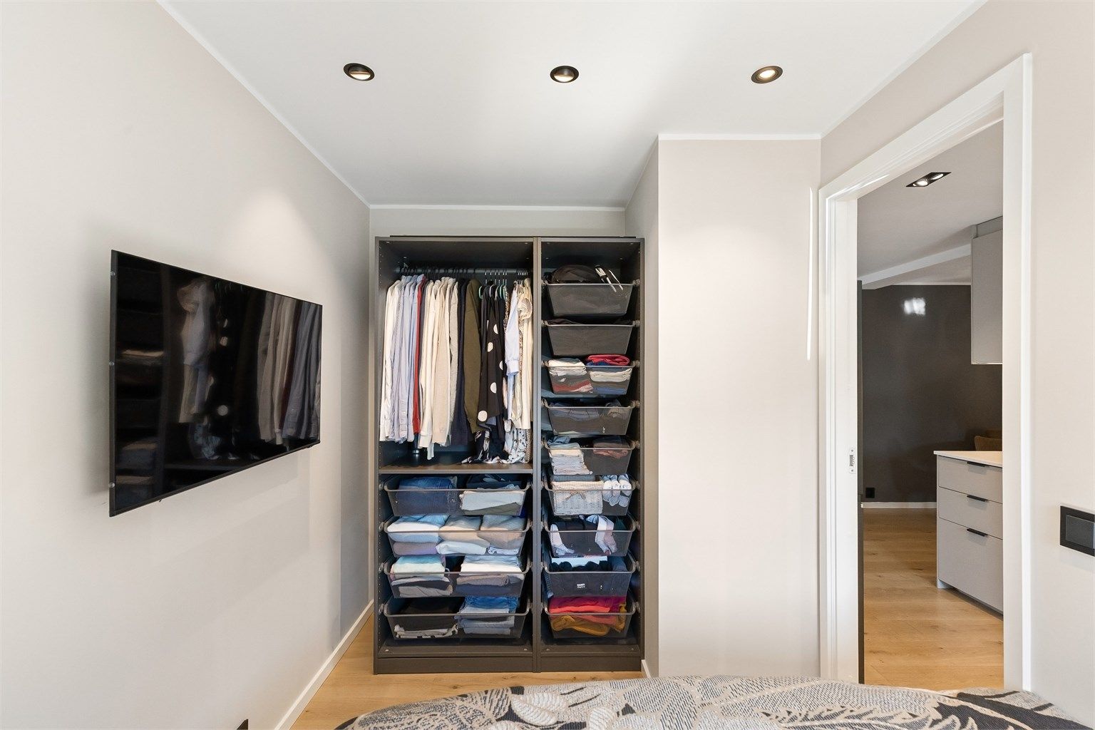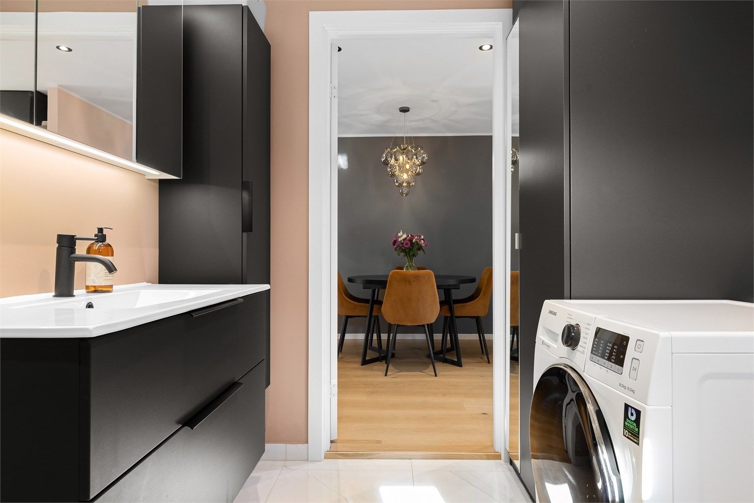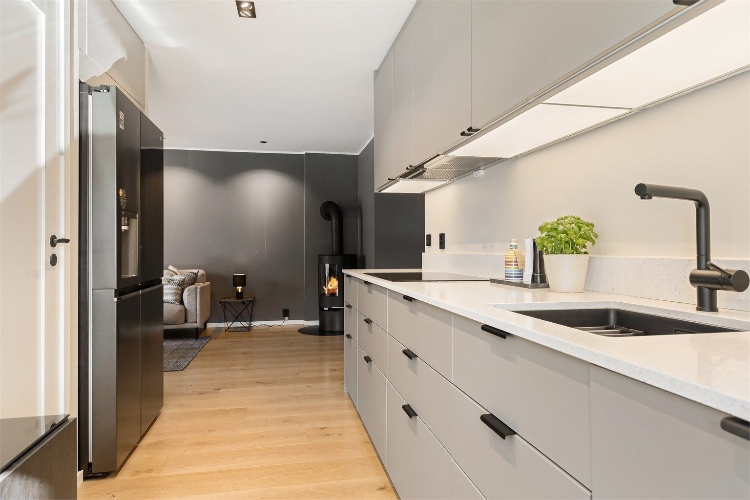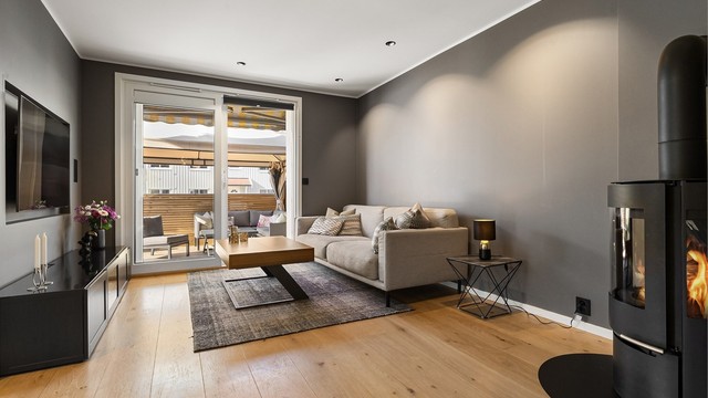 Lys og moderne leilighet med god planløsning, bestående av entré, bad, rom benyttet som soverom, soverom samt åpen stue- og kjøkkenløsning. Boligen ble oppgradert i 2023 og fremstår med tidsriktige materialvalg. I forbindelse med oppussing ble det opprinnelige kjøkkenet gjort om til soverom, og soverommet ble gjort om til kjøkken og soverom. Badet er delikat utført med flislagt gulv med gulvvarme, flislagte og malte vegger, samt malte himlingsflater. Innredningen inkluderer vegghengt servant, speil med overlys, vegghengt baderomsmøbel, dusjhjørne med dører, vegghengt toalett og opplegg for vaskemaskin. Kjøkkenet har en åpen løsning mot stuen og er utstyrt med glatte fronter, benkeplate i kompositt, nedfelt vask med armatur, integrert stekeovn, platetopp og oppvaskmaskin, samt frittstående kjøleskap med fryser og ventilator i overskap. Fra stuen er det utgang til en romslig og solrik sydvestvendt terrasse på hele 31 kvm.