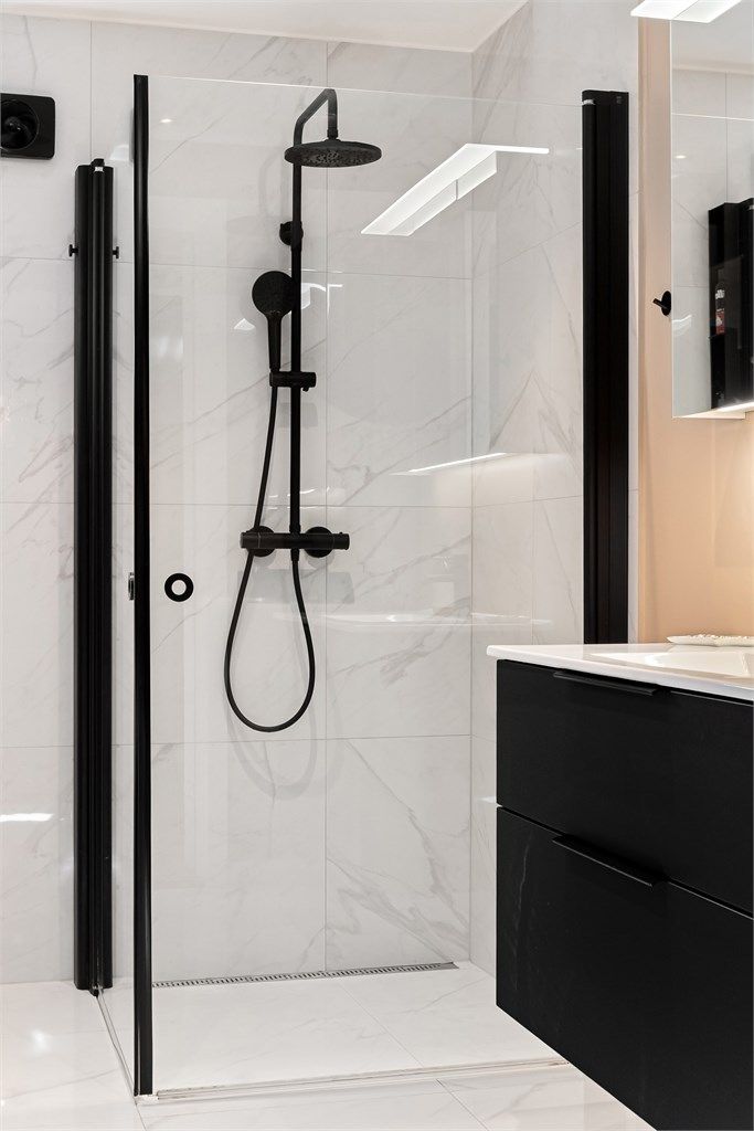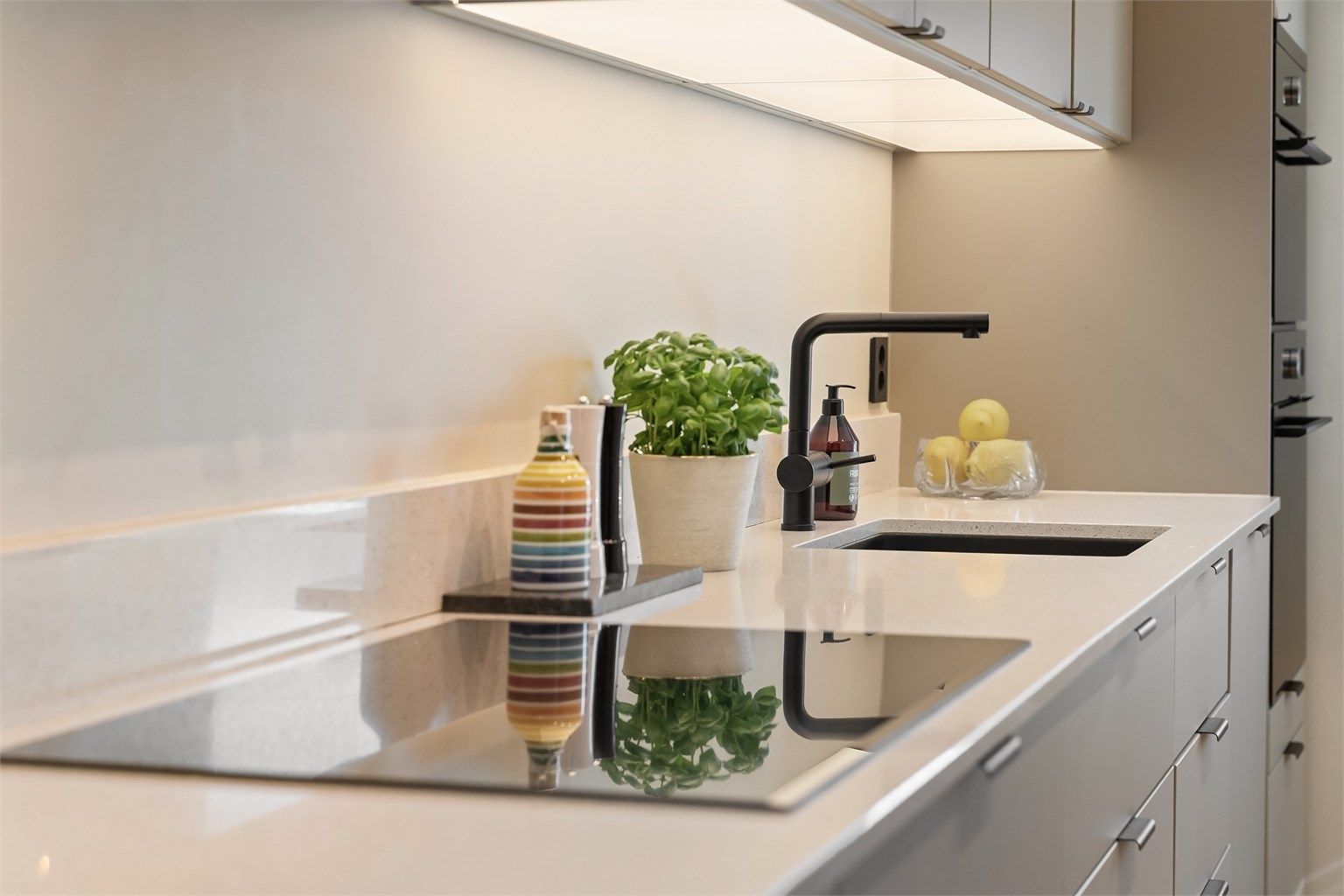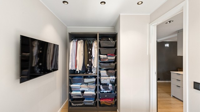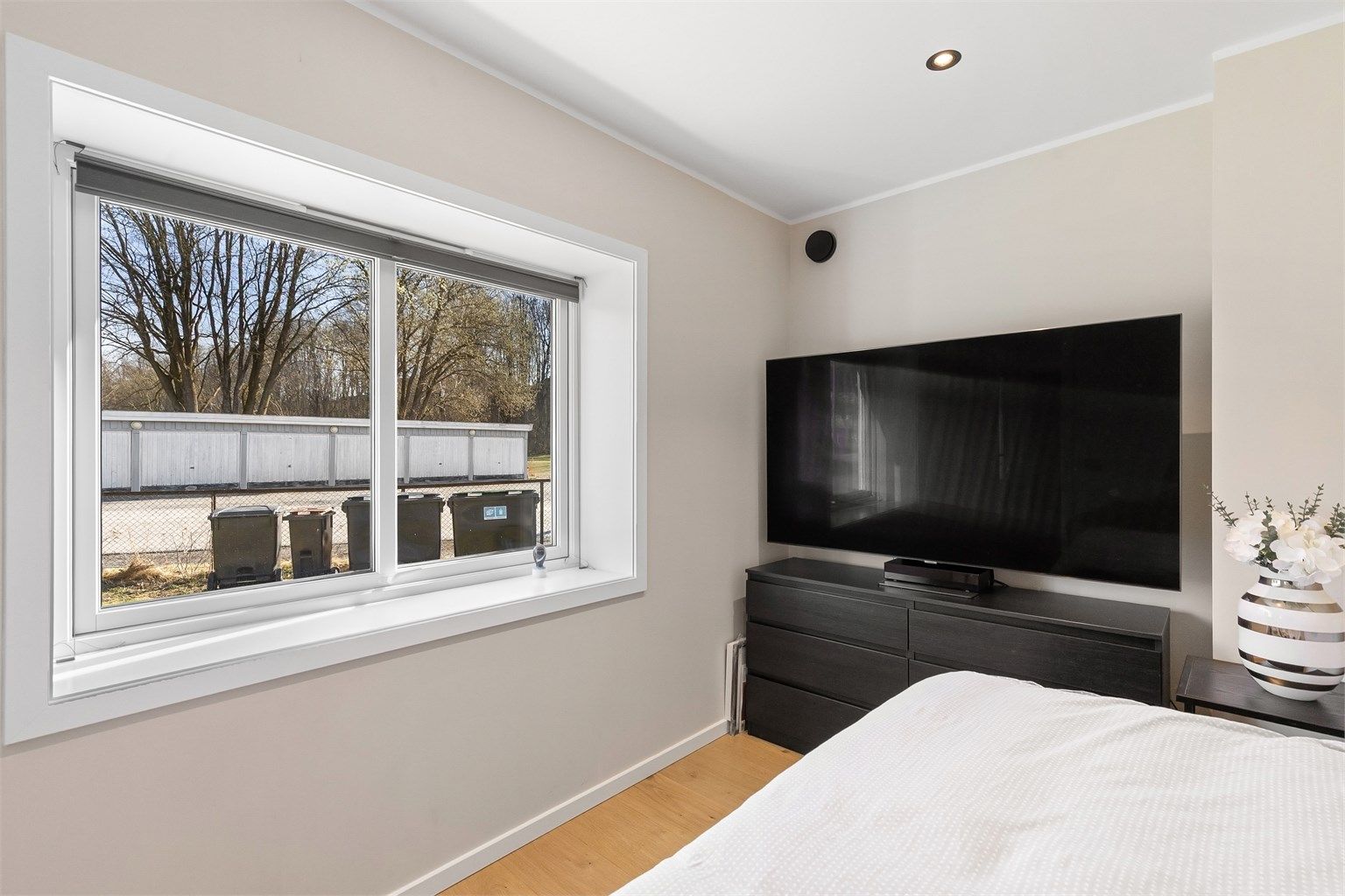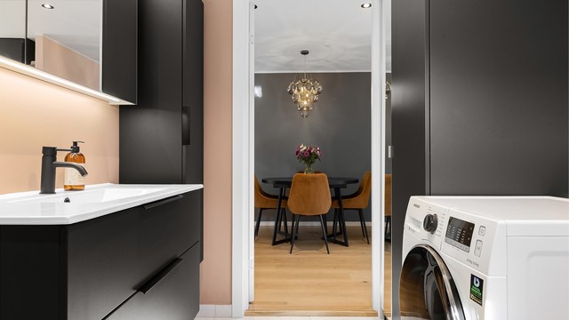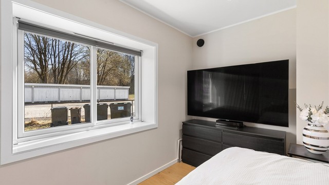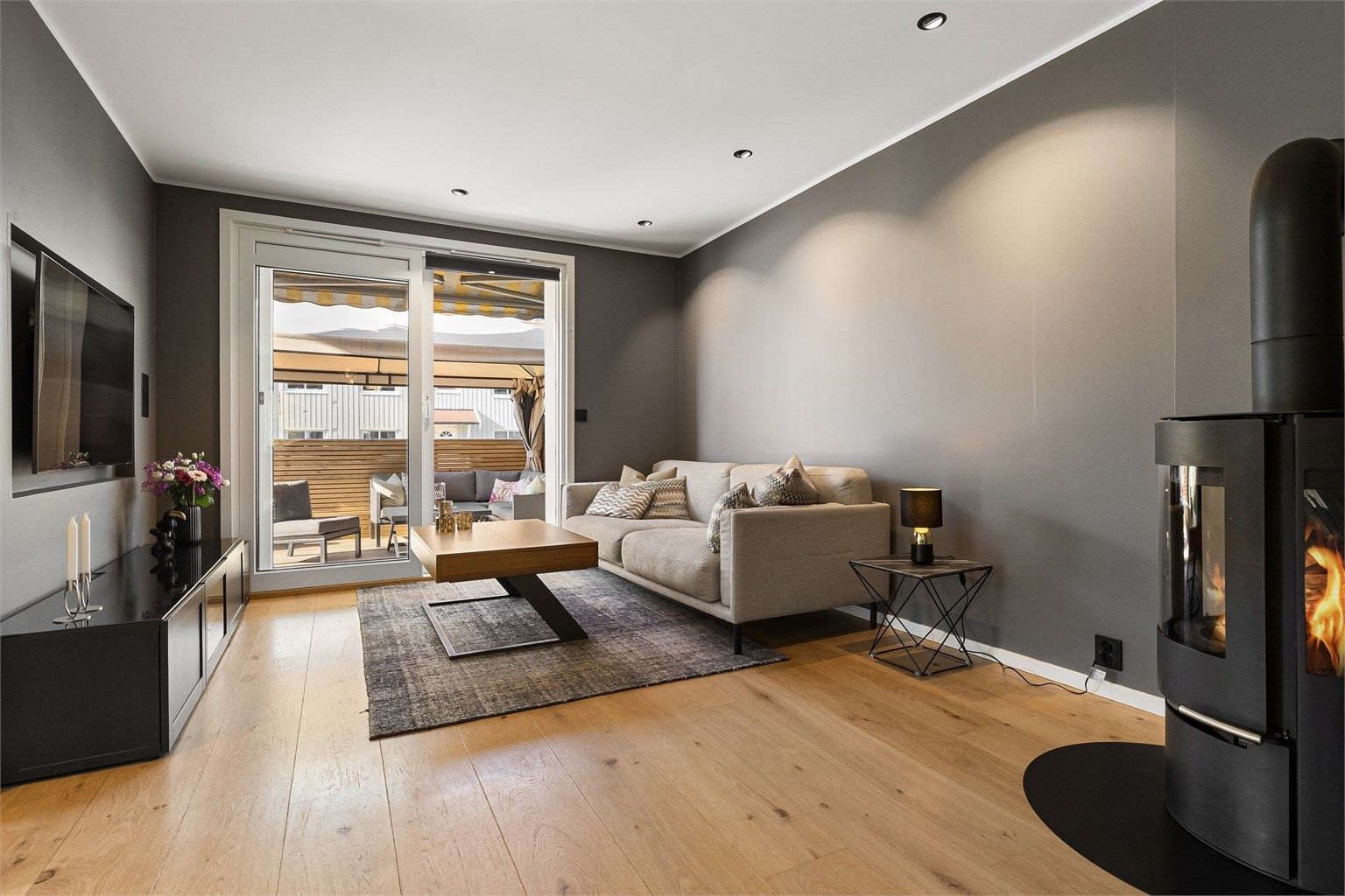 Lys og moderne leilighet med god planløsning, bestående av entré, bad, rom benyttet som soverom, soverom samt åpen stue- og kjøkkenløsning. Boligen ble oppgradert i 2023 og fremstår med tidsriktige materialvalg. I forbindelse med oppussing ble det opprinnelige kjøkkenet gjort om til soverom, og soverommet ble gjort om til kjøkken og soverom. Badet er delikat utført med flislagt gulv med gulvvarme, flislagte og malte vegger, samt malte himlingsflater. Innredningen inkluderer vegghengt servant, speil med overlys, vegghengt baderomsmøbel, dusjhjørne med dører, vegghengt toalett og opplegg for vaskemaskin. Kjøkkenet har en åpen løsning mot stuen og er utstyrt med glatte fronter, benkeplate i kompositt, nedfelt vask med armatur, integrert stekeovn, platetopp og oppvaskmaskin, samt frittstående kjøleskap med fryser og ventilator i overskap. Fra stuen er det utgang til en romslig og solrik sydvestvendt terrasse på hele 31 kvm.