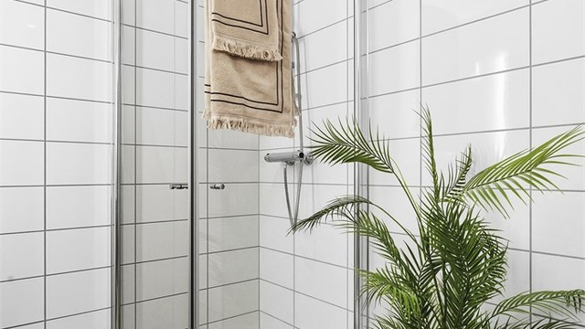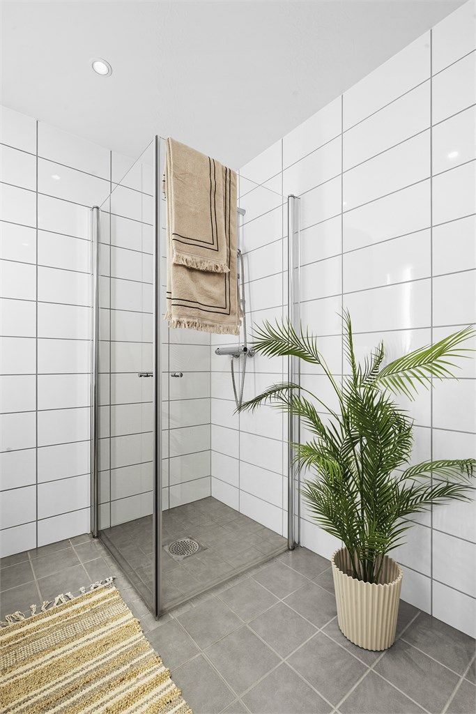 Moderne flislagt bad. Dusjnisje med innfellbare glassvegger. Opplegg for vaskemaskin. Veggmontert toalett.