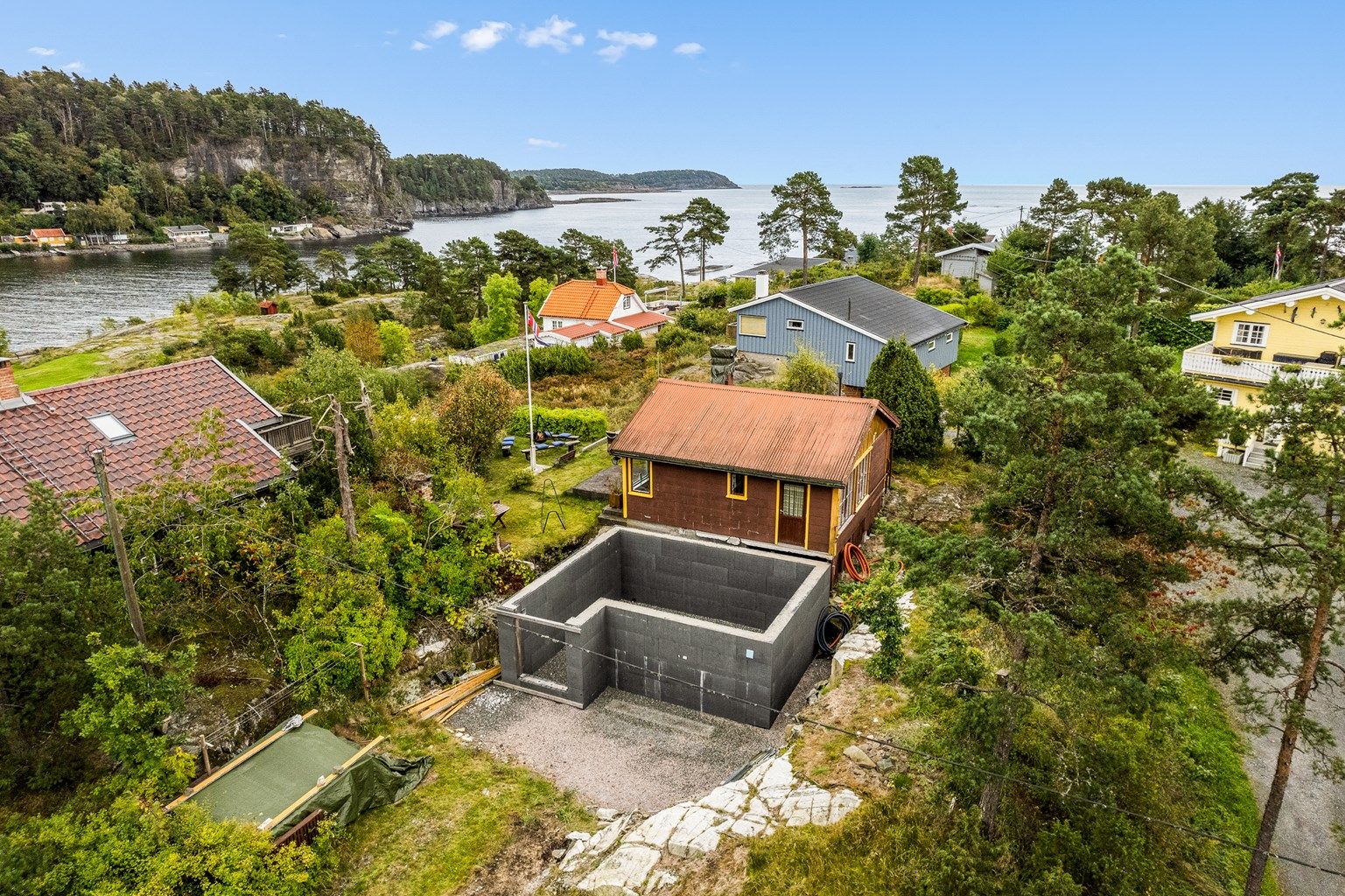 Dette er en eiendom som bør utvikles og har et stort potensiale. Her er det bilvei frem og kort avstand ned til sjøen. Fin utsikt og gode solforhold er også noe av det vi kan skilte med. Selve hytta er ikke mye å skryte av. Den er enkel og har behov for påkostninger. Ny hytte er arkitekttegnet, og godkjent, med maks utnyttelse ihht reguleringsplan samt kjellerrom. Grunnmur for tilbygg satt opp med Vartdal elementer. Vann og avløpsledninger er lagt inn i planlagt teknisk rom i kjeller. Tilkobling er betalt. Fiber er installert i hytta.