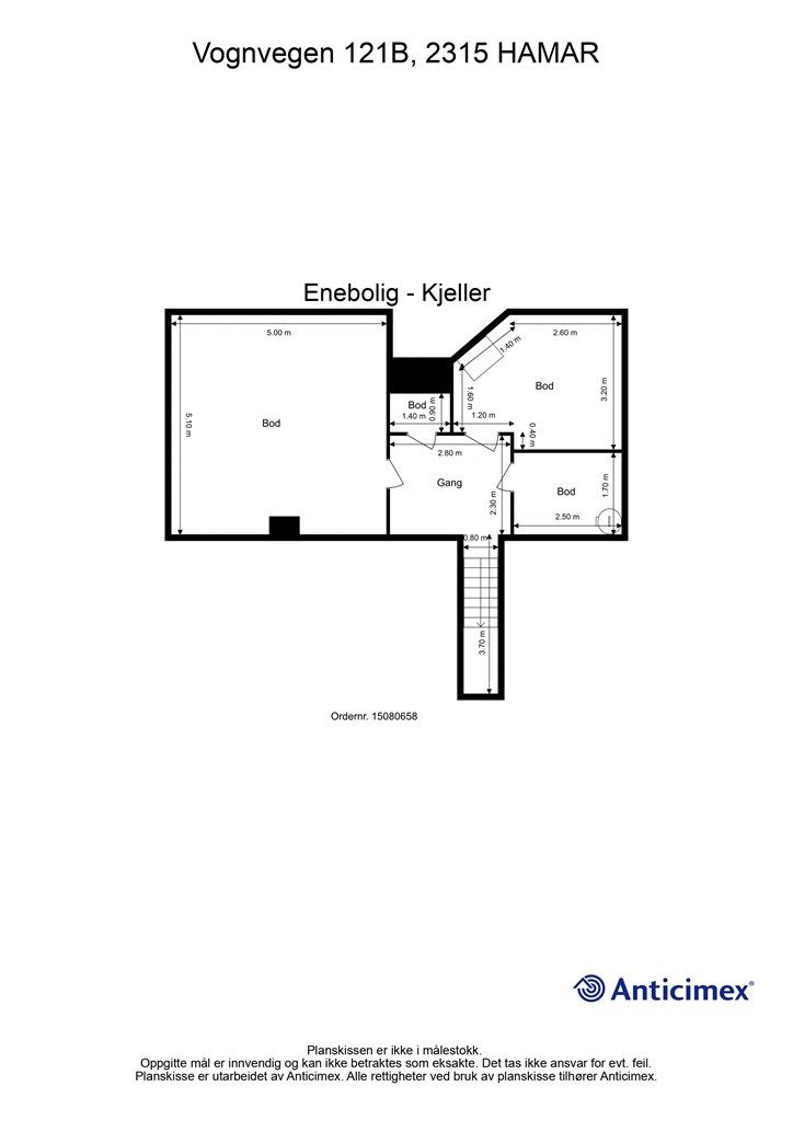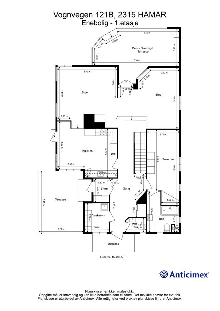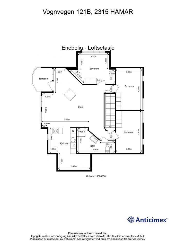 Vedlagte plantegninger er ikke målbare. De oppgitte arealer er hentet fra rapport med befaringsdato 27.03.2026 utført av Anticimex AS v/Alf-Harald Guriby. Arealene er beregnet og rom er definert etter dagens faktiske bruk, uavhengig av hva som er godkjent av bygningsmyndighetene.