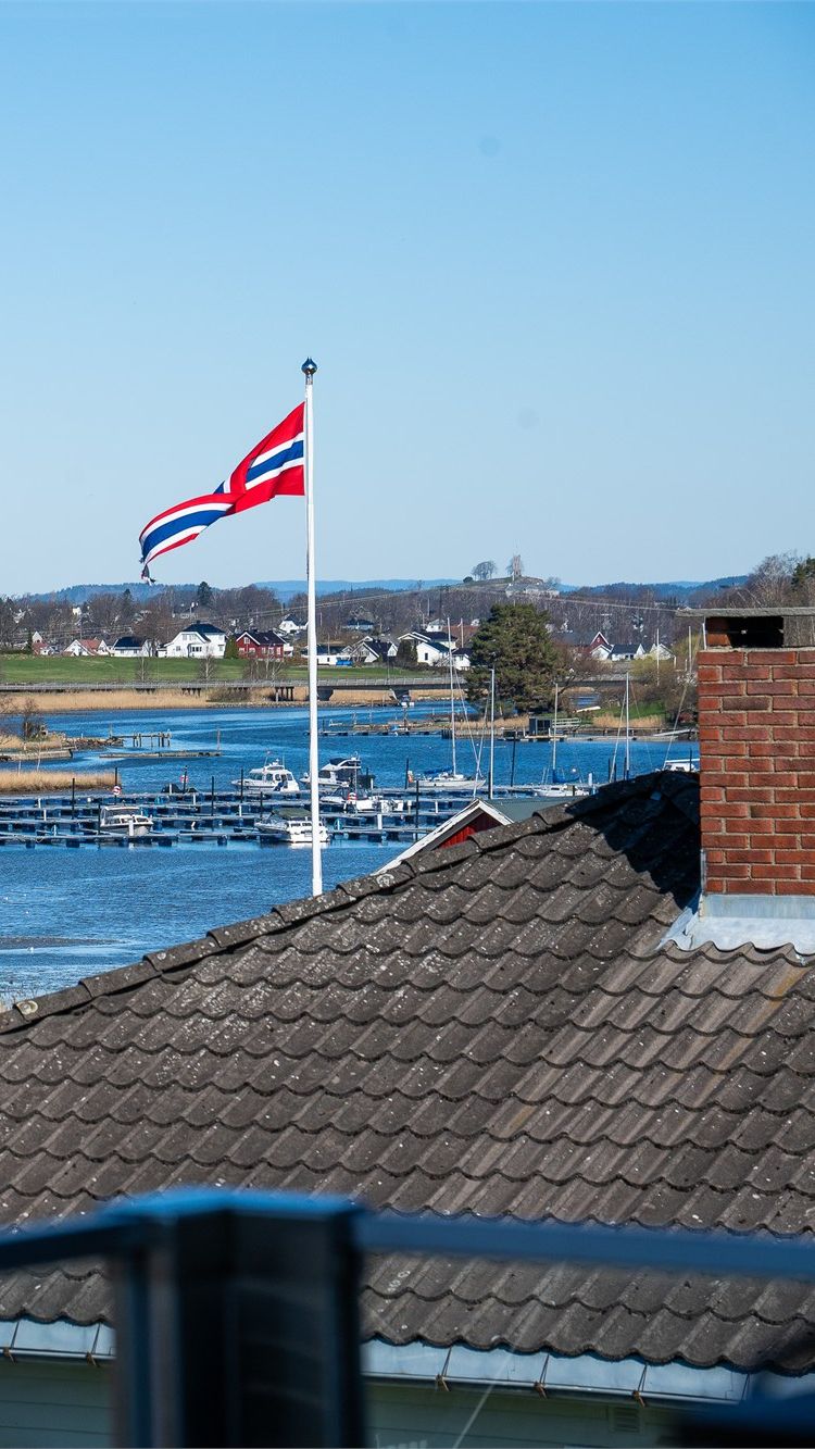 Oppholdsrommet inviterer til både avslapning og sosiale sammenkomster, med peis som tilfører varme og atmosfære. Fra kjøkkenet er det direkte utgang til solrik uteplass med stor motorisert markise over hele balkongen. Her er det også varmelist.