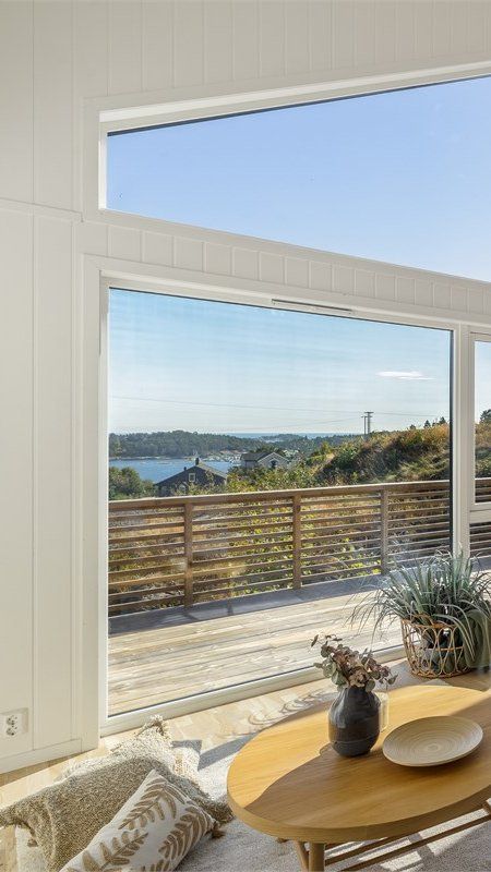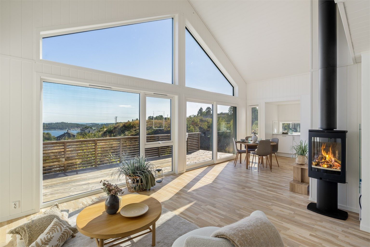 Hytta er gjennomført med parkett på gulv og malte panelplater på både vegger og himlinger. Planløsningen er åpen mellom stue og kjøkken, med god takhøyde som gir en romslig følelse. Store vindusflater vender ut mot sjøen og slipper inn rikelig med lys og natur.