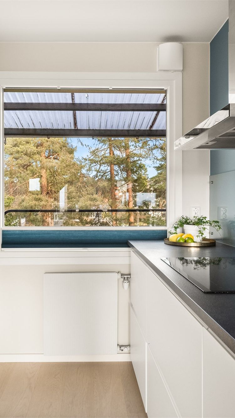 Kjøkkenet fra 2018 er plassert i en åpen løsning mot stuen, men fungerer som en egen, definert sone. Innredningen har glatte, hvite fronter og en mørk laminatbenkeplate. Alle hvitevarer er integrerte, inkludert stekeovn, mikrobølgeovn, induksjonstopp og oppvaskmaskin. Kjøkkenøya fungerer som en naturlig overgang mot stuen og gir ekstra arbeids- og sitteplass.