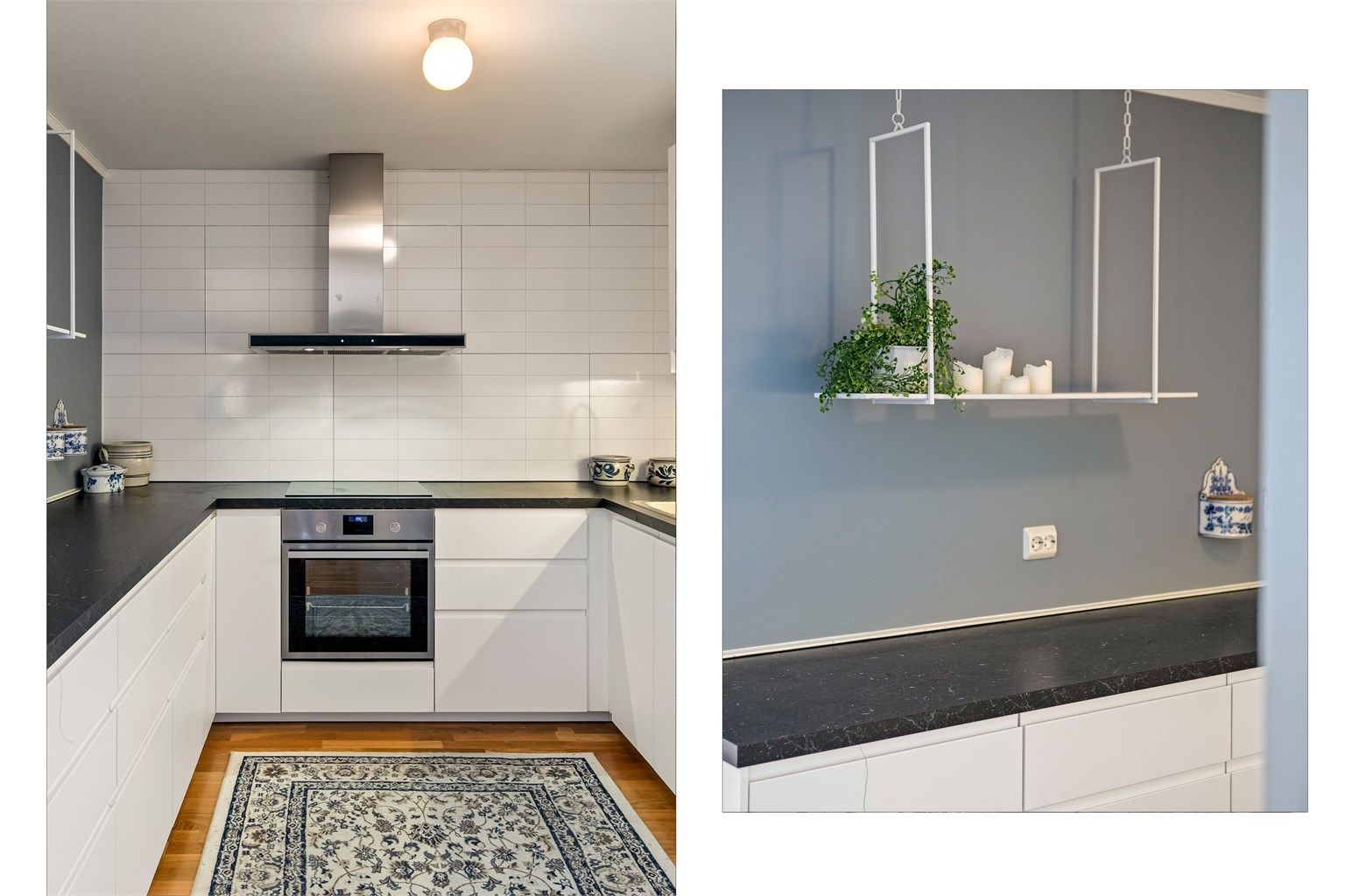 Leilighetens kjøkken er fra ca. 2017, ifølge selger. Rommet er godt utnyttet og ligger i åpen løsning mot spisestuen. Innredningen er moderne og delikat i lys utførelse. Det er rikelig med skap- og benkeplass. Flisplater er montert på veggen over benkeplaten. Det er kun følgende hvitevarer på kjøkkenet som følger med leiligheten: integrert platetopp, komfyr, oppvaskmaskin samt kjøleskap. Det gjøres oppmerksom på at hvitevarene er kjøpt for noen år tilbake, og kjøper må forvente slitasje som følge av alder og normal bruk.