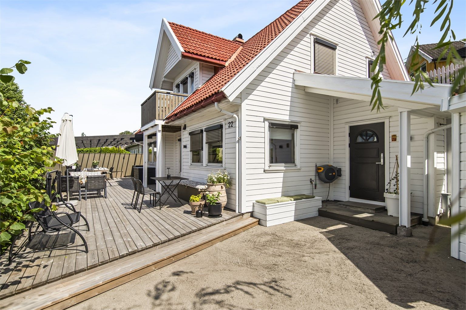 En flott og innbydende enebolig med praktisk planløsning og solrik beliggenhet i barnevennlige omgivelser. Boligen holder en gjennomgående meget god standard, inneholder en romslig stue med direkte utgang til en solrik terrasse – perfekt for både hverdagsliv og lange hyggelige sommerdager ute. Rålekkert kjøkken, bad, gjestetoalett, separat vaskerom, loftstue, 3 soverom, samt meget god lagringsplass i kneveggene. Garasjen ble i 2017 oppgradert og bygget om til en separat boenhet, med mulighet for utleie og ekstra inntekter, eller egen boligdel for gjester eller ungdom som ønsker litt ekstra privatliv.