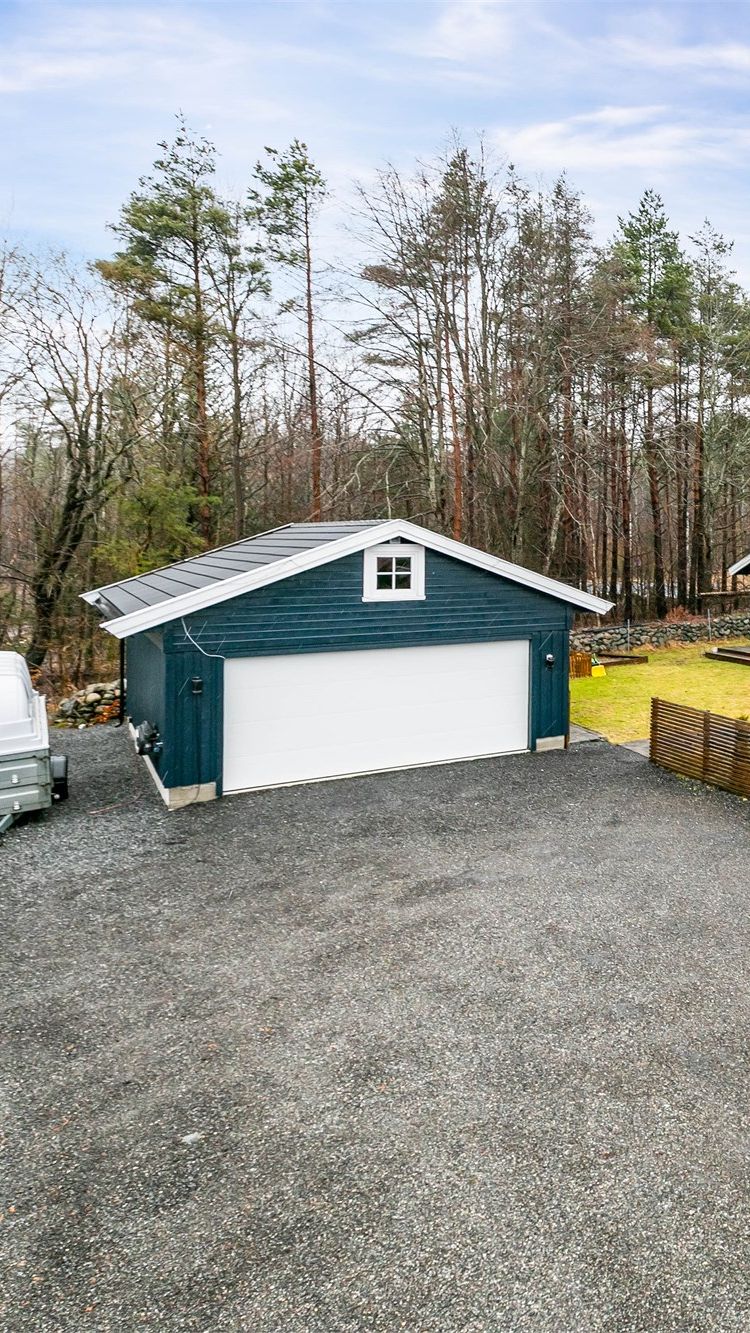 Garasjen er iht. tilstandsrapport, en frittstående garasje. Støpt plate på mark. Grunnmur av lettklinkerblokker. Bygning i trekonstruksjoner. Fasaden er kledd med stående/liggende trekledning. Saltak i trekonstruksjoner (besiktiget fra bakkenivå). Yttertak er utvendig tekket med takstein. Ifølge huseier har konstruksjonen isolerte vegger og tak. Takstolene er stedvis bygget opp med plater.