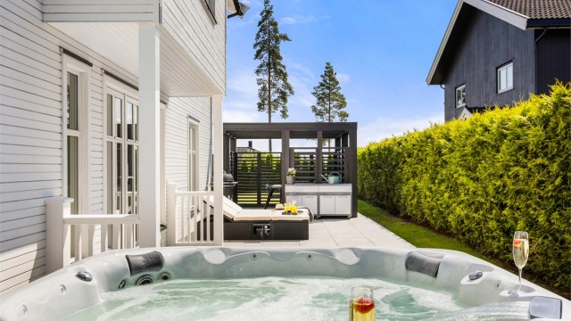 Utendørs får du en pent opparbeidet tomt med ferdigplen, hekk og asfaltert innkjørsel. Den store terrasseplassen på 99 kvm inkluderer både boblebad og pergola – perfekt for sosiale sammenkomster. Dobbelgarasje og to elbilladere følger med.