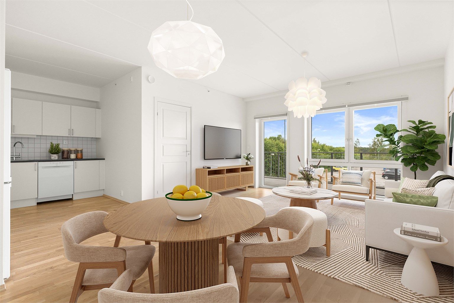 Leiligheten har en åpen løsning mellom stue og kjøkken som gir en luftig og trivelig romfølelse. Stuen har direkte utgang til en solrik veranda - en hyggelig uteplass for rolige stunder og besøk. Videre består boligen av to soverom, et romslig bad og et moderne kjøkken i lyse, tidløse farger.