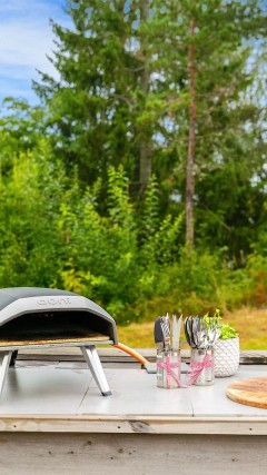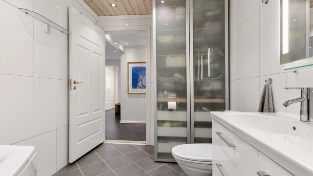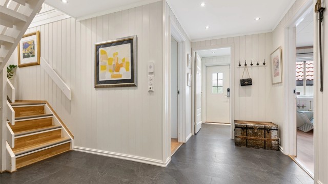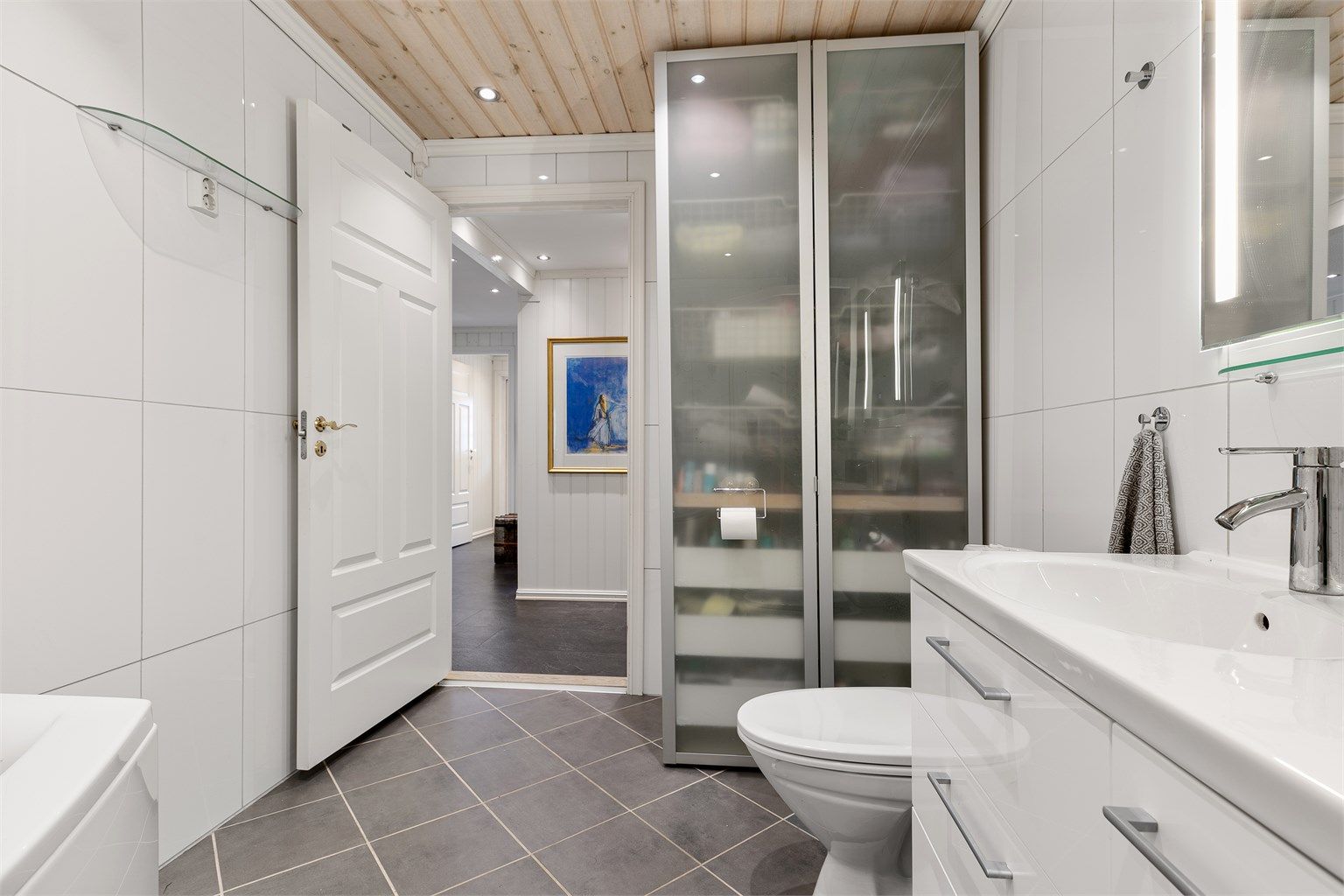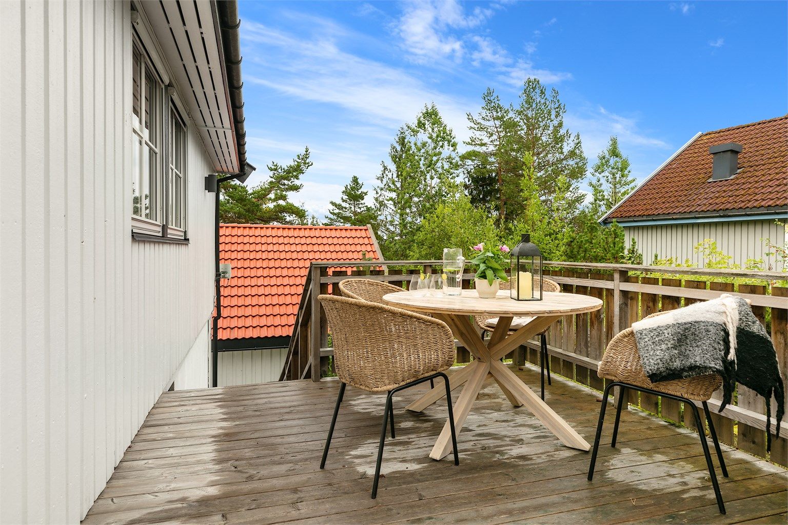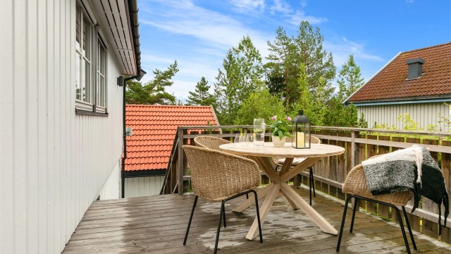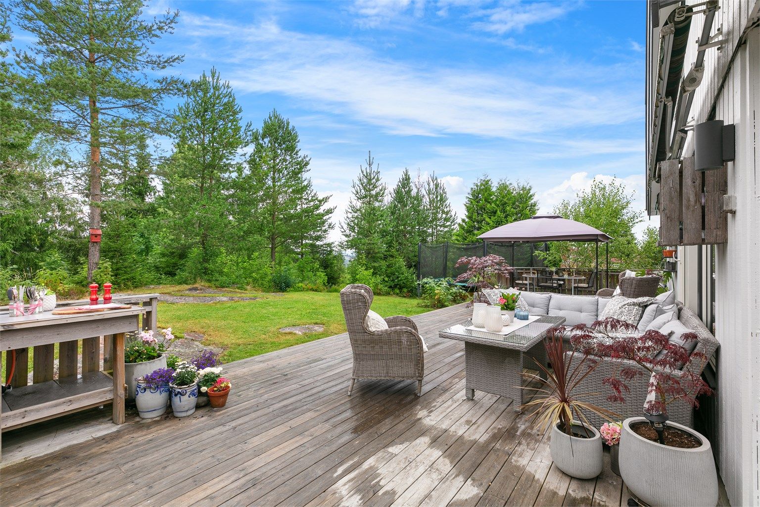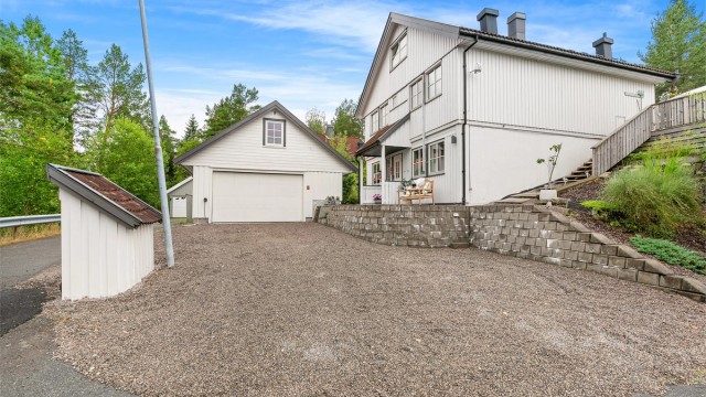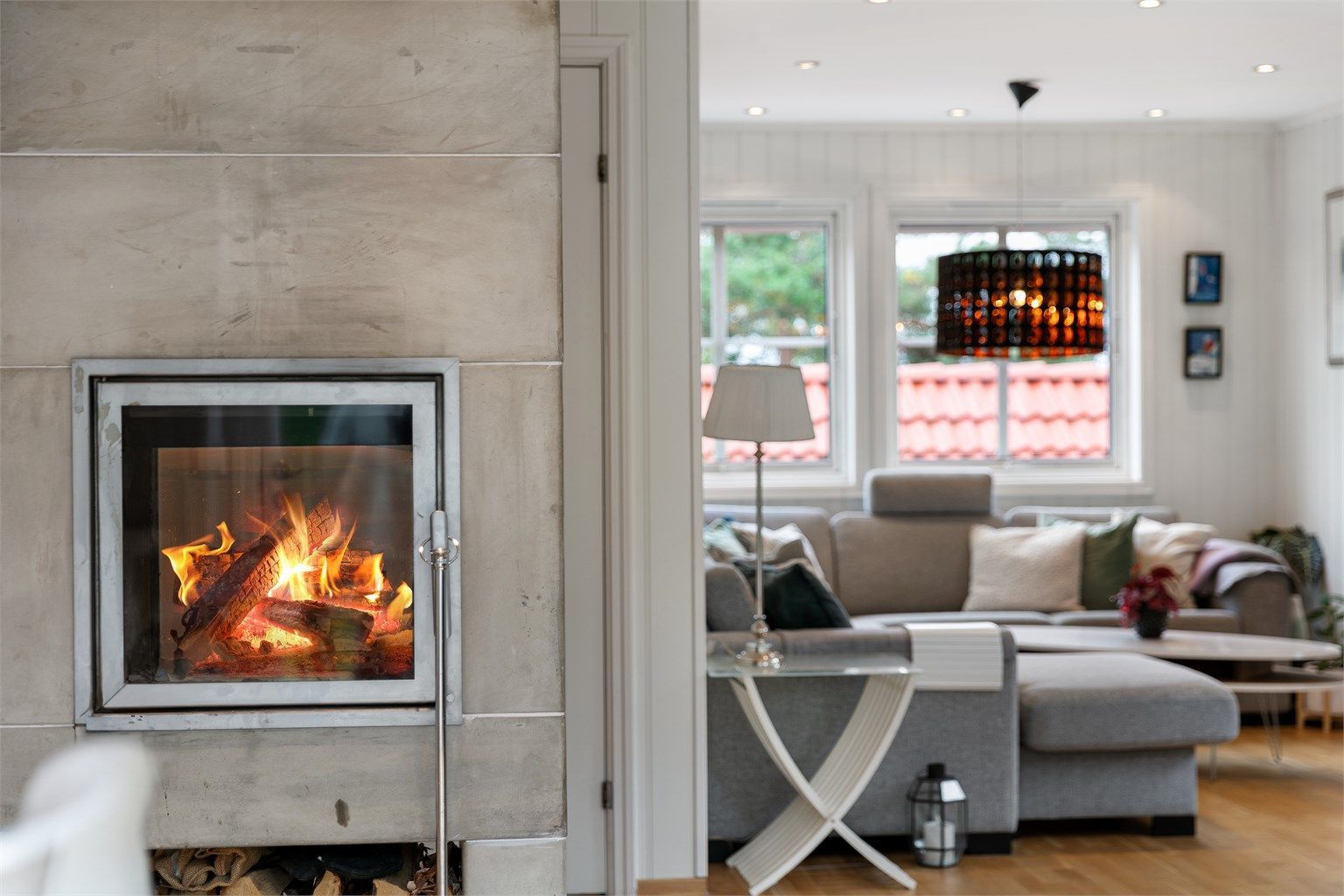 Terrassen er en herlig forlengelse av stuen og kjøkkenet; et lyst, åpent og sosialt allrom med spisestue, store vinduer og gjennomgående klebersteinspeis. Kjøkkenet har mye oppbevaring, gode arbeidsflater og integrerte hvitevarer. Med to bad, loftstue og fire soverom egner boligen seg godt for familier. Bilen parkeres på en stor gårdsplass og i en dobbelgarasje med loft.