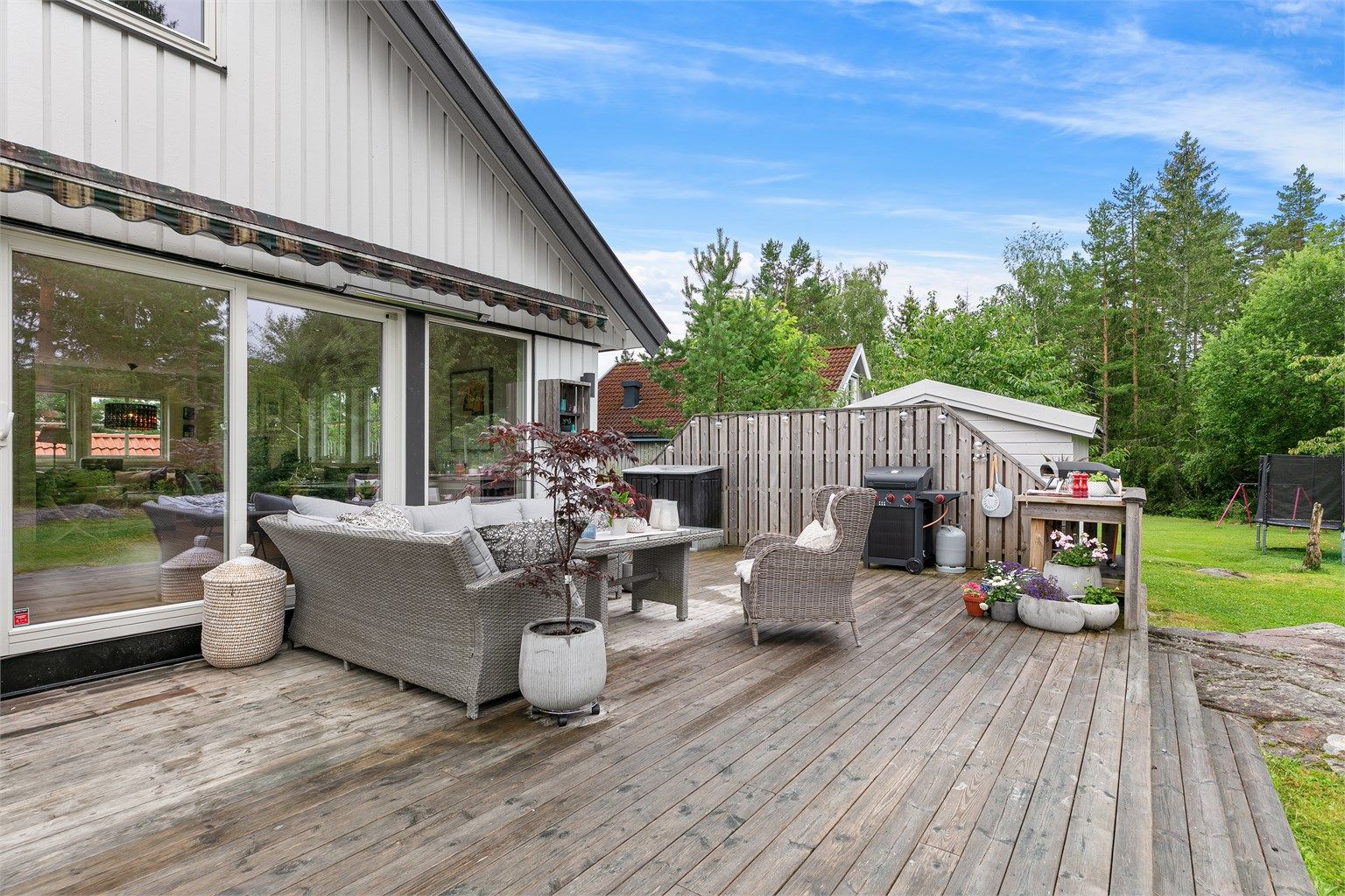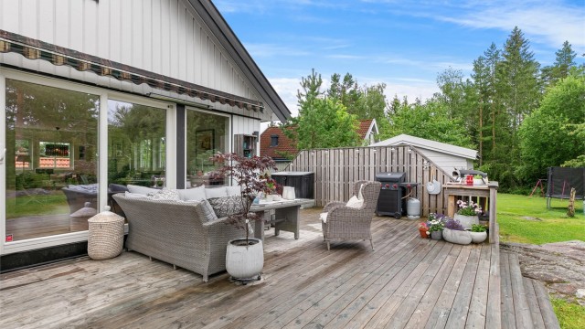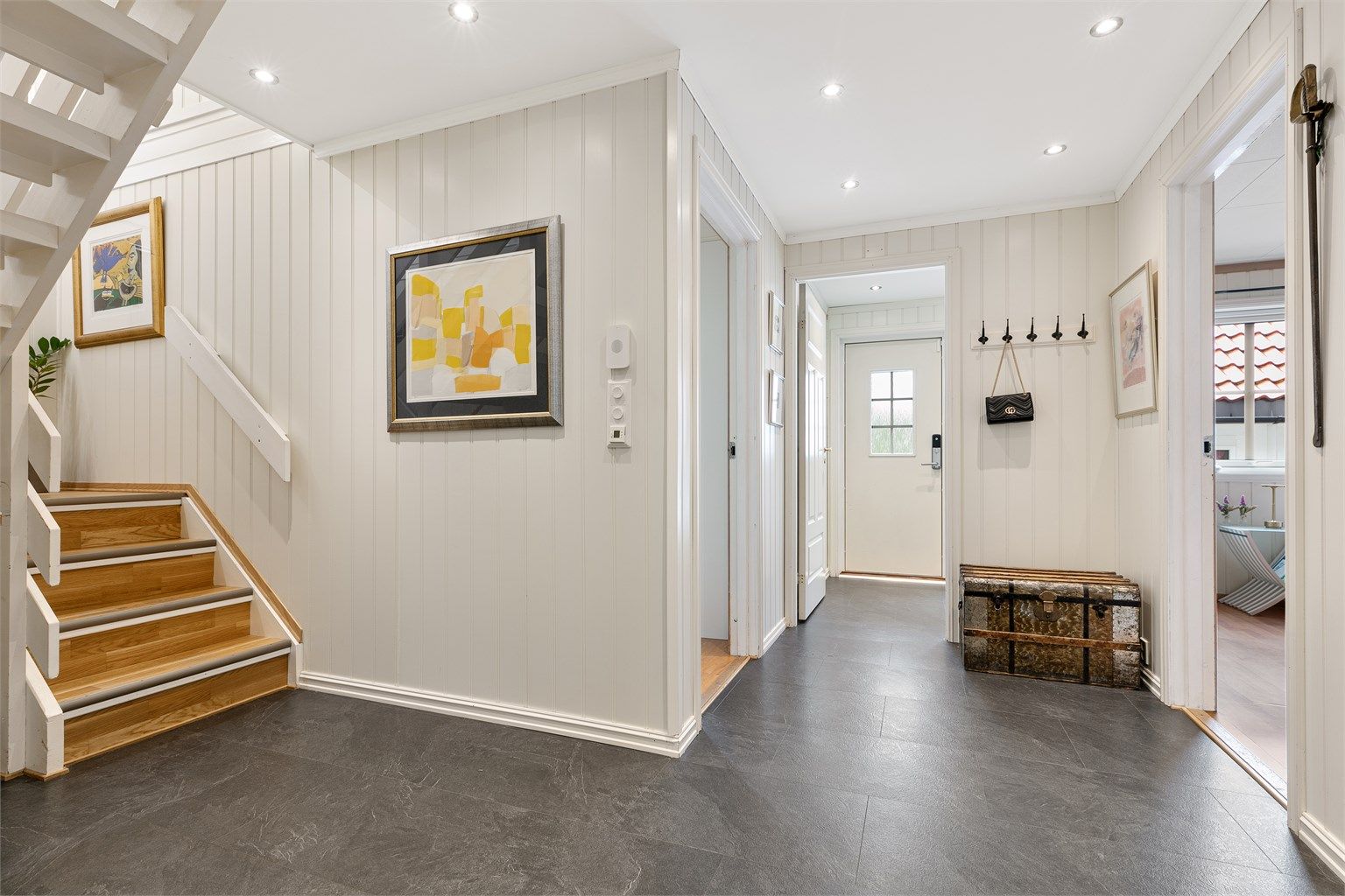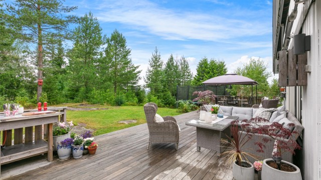 Romslig familiebolig med mye naturlig lys, solrike uteplasser og stor, usjenert bakhage. Dobbelgarasje m/innredet rom.