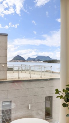 Stor åpen loftsstue/trapperom med store vindusflater. Parkett på gulv, malte vegger og tak. Skyvedør ut til stor takterrasse på 42 kvm som dels er overbygd. Flott utsikt vestover mot Ratvika og Borgundfjorden. Det er mulighet for å etablere et tredje soverom i boligen mot vest om ønskelig (avsatt på originale byggetegninger).
