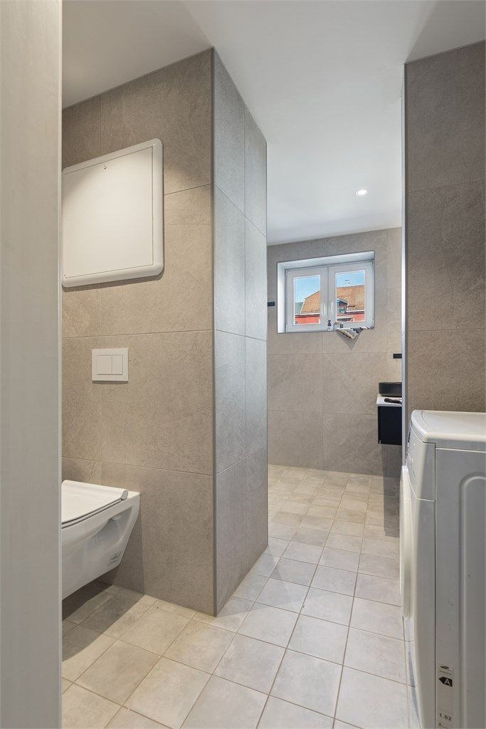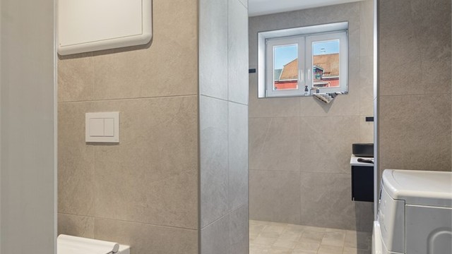 Meget delikat bad fra 2024 med flislagte overflater, gulvvarme, dusjhjørne og opplegg for vaskemaskin.