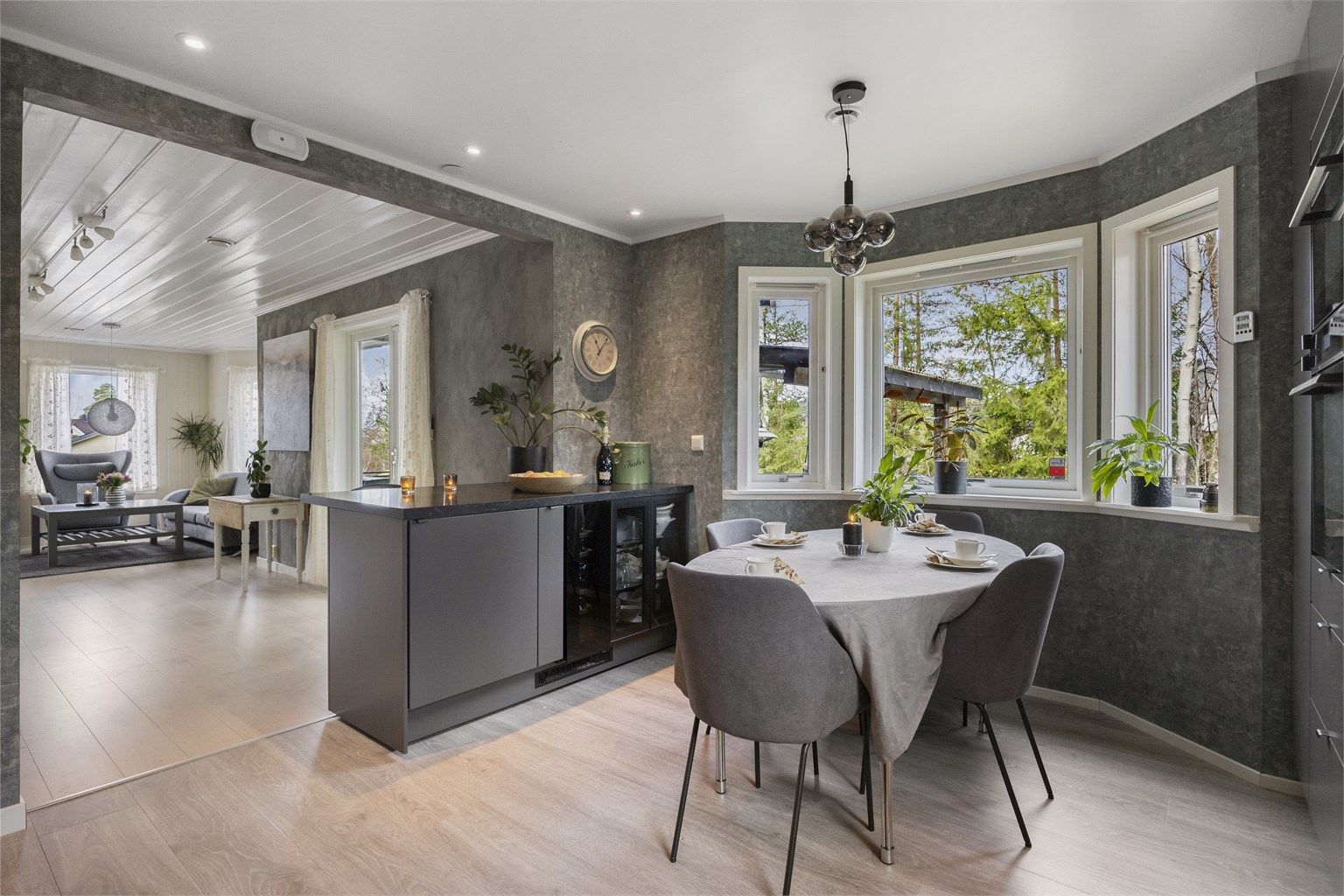 Kjøkken: Kjøkkenet har åpen løsning mot stuen, der en stilfull kjøkkenøy skaper et naturlig og funksjonelt skille mellom sonene. Innredningen fra 2022 har slette fronter og en laminert benkeplate som gir et rent og tidløst uttrykk. Praktiske detaljer som nedfelt oppvaskkum med ettgreps armatur og glassplater over vask, samt platetopp gir både stil og enkel rengjøring. Her finner du alt av integrerte hvitevarer: Stort kjøleskap med frysedel, oppvaskmaskin, platetopp med ventilasjon samt stekeovn og kombiovn med mikroovn i kjøkkenskap. Vinkjøler samt lite fryseskap i kjøkkenøy. Platetoppen har en innebygd ventilator med kullfilter. Kjøkkenet byr på rikelig med skapplass, skuffer og gode arbeidsflater – perfekt for både hverdagsmatlaging og sosiale sammenkomster. Det er plass til spisebord og stoler. Kjøkkenøya har en frokostbar hvor morgenkaffen kan nytes. Kjøkkenøya kan enkelt flyttes på da den står på hjul.