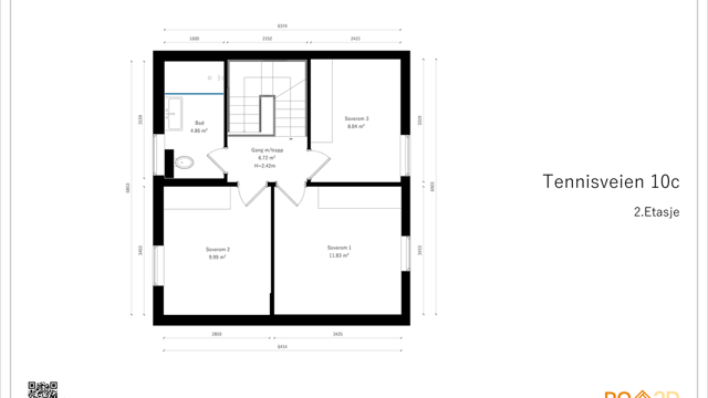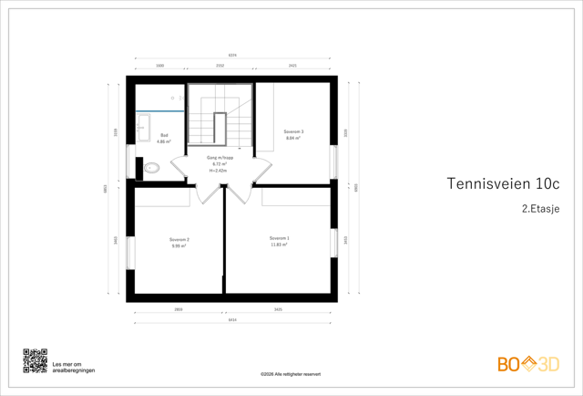 2. etasje 44 kvm: Gang, soverom 1, soverom 2, soverom 3, bad.