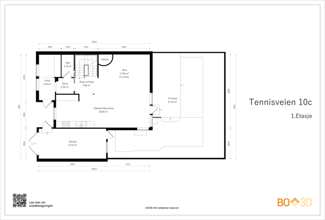 Vedlagte plantegninger er ikke målbare. De oppgitte arealer er hentet fra rapport med befaringsdato 27.03.2026 utført av EK Takst AS v/Thomas Espolin-Kahrs. Arealene er beregnet og rom er definert etter dagens faktiske bruk, uavhengig av hva som er godkjent av bygningsmyndighetene.