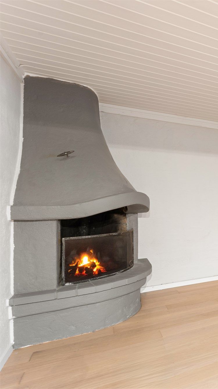 Stuen er boligens samlingspunkt, med enstavs parkett på gulvet og god plass til både en stor sofagruppe og et spisebord. En peis med innsats gir varme og atmosfære. Rommet har en delvis åpen løsning mot kjøkkenet, og en skyvedør skiller stuen fra gangen. Fra stuen er det direkte utgang til den store terrassen og den skjermede hagen.