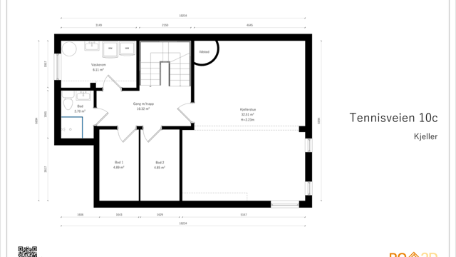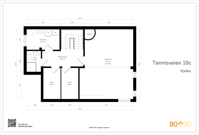 Kjeller 64 kvm: Trappegang, kjellerstue, bod 1, bod 2, bad, vaskerom.