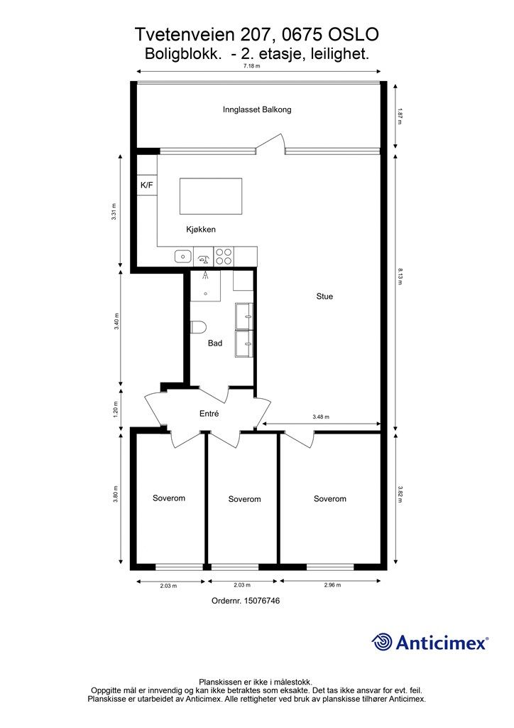 Vedlagte plantegninger er ikke målbare. De oppgitte arealer er hentet fra rapport med befaringsdato 23.10.2025 utført av Anticimex AS v/Owe Fagerlund Leret.